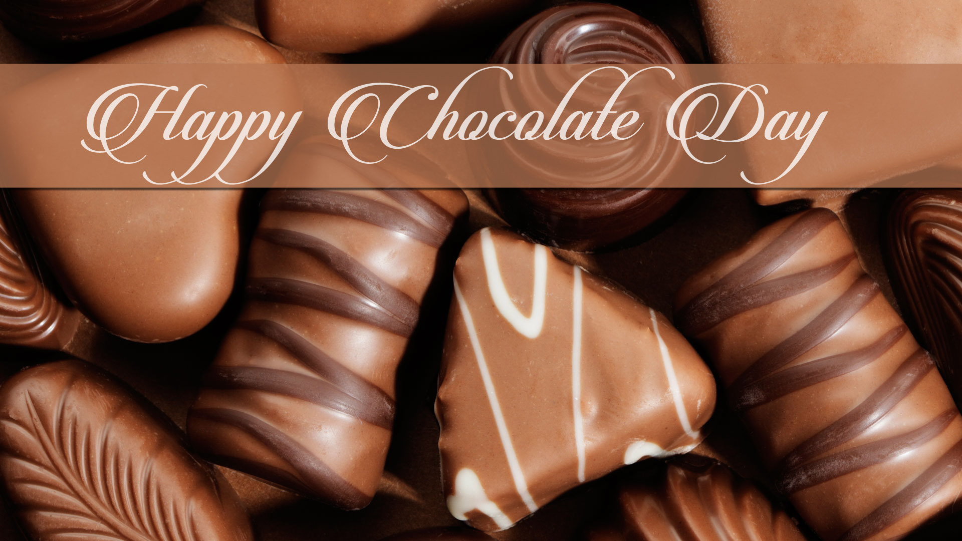 Description: A pile of chocolates with a happy chocolate day message on it's side in a brown and white frame.