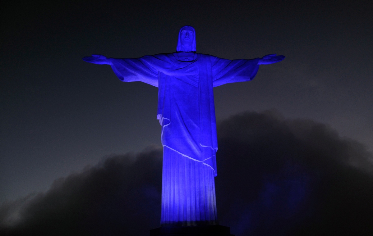 Description: A statue of christ illuminated in blue light in the dark sky with clouds behind it and a dark sky behind it.