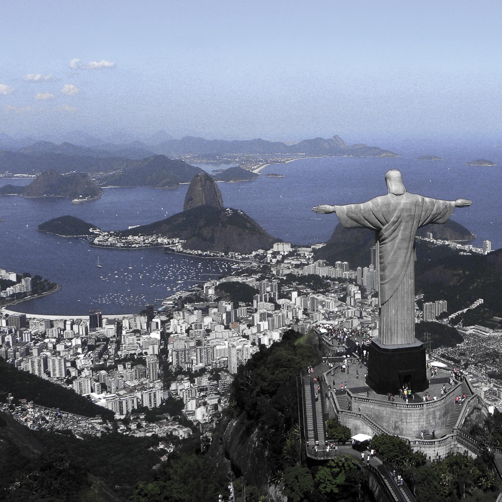 Description: A statue of christ overlooking a city and the ocean in rio.