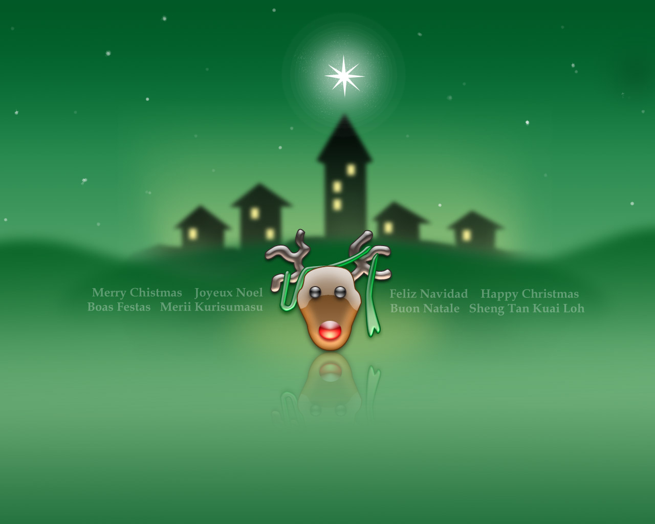 Description: A christmas card with a reindeer and a house in the background with a star above it and a green background.