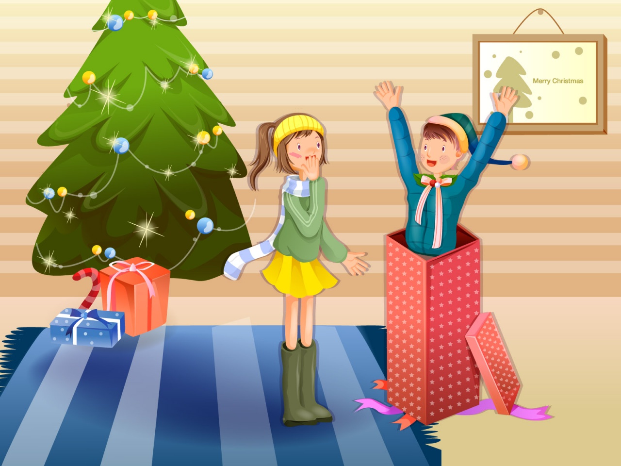 Description: A boy and a girl are standing in front of a christmas tree with presents under it and a christmas tree behind them.