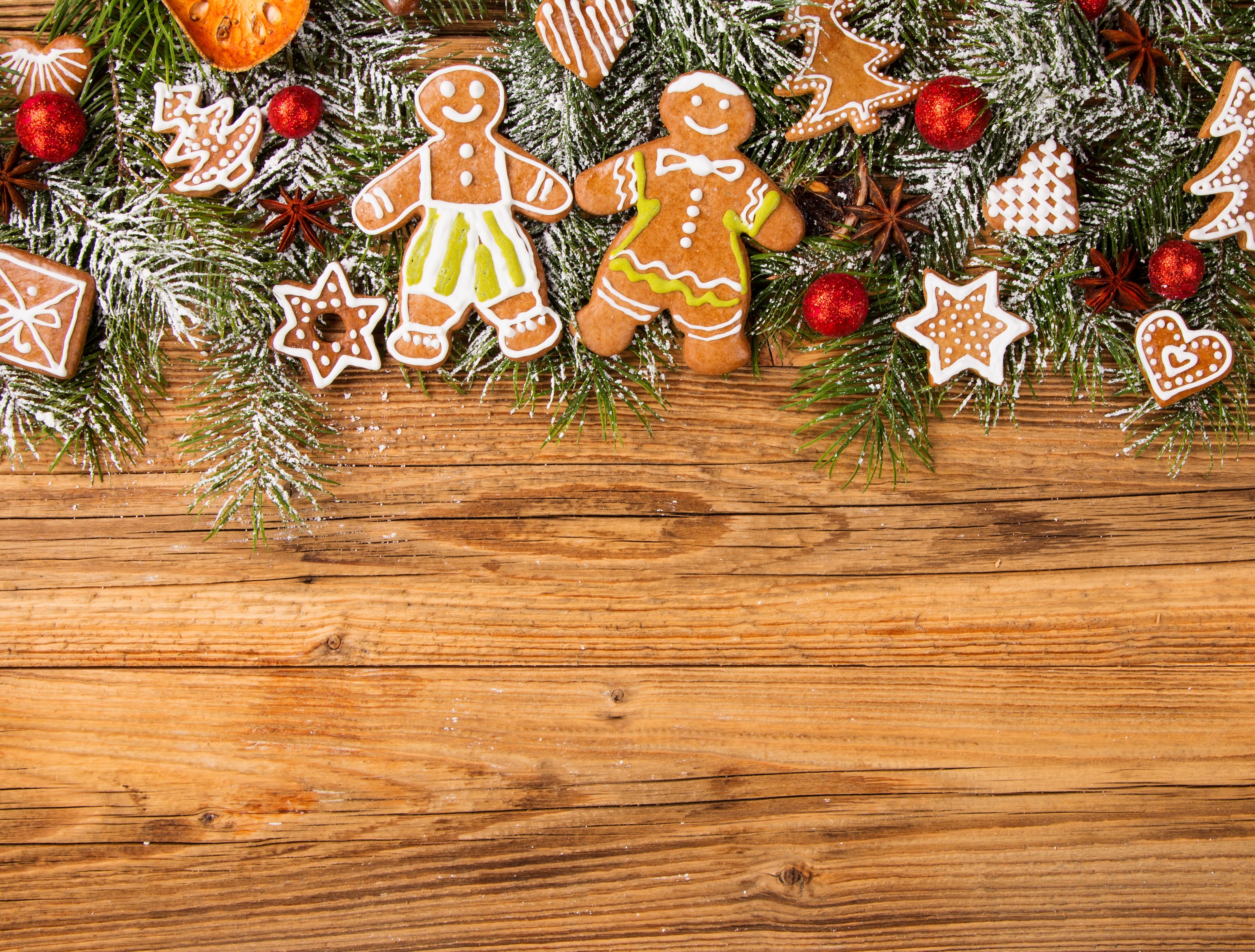 Description: A wooden table topped with lots of christmas cookies and decorations on top of it.
