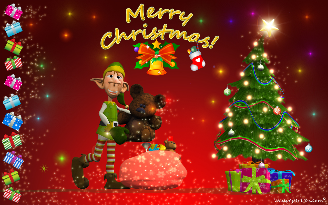 Description: A christmas card with a elf and a teddy bear sitting on a sack of presents next to a christmas tree.