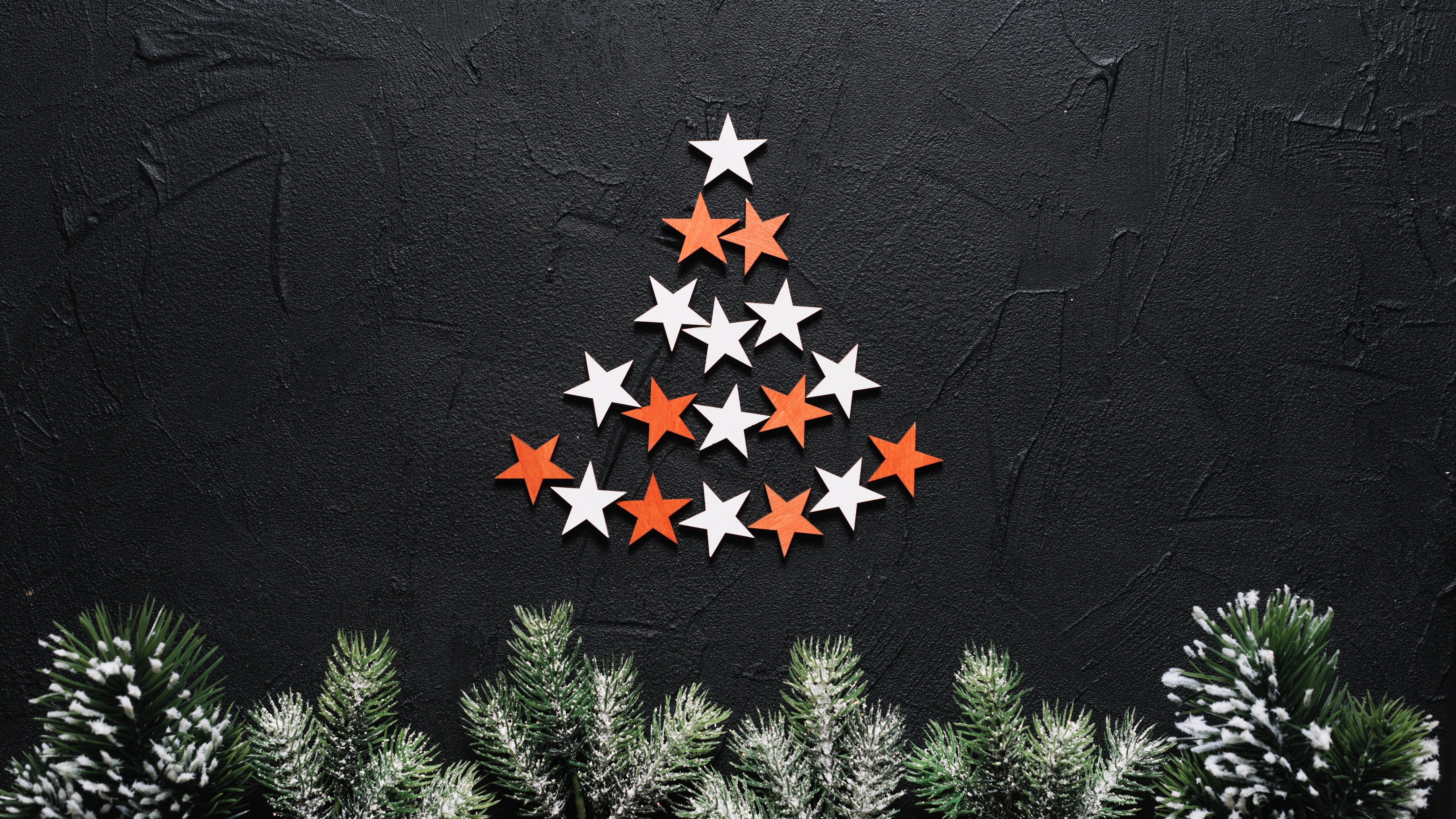 Description: A christmas tree made out of red and white stars on a black background with evergreen branches and snow on the ground.