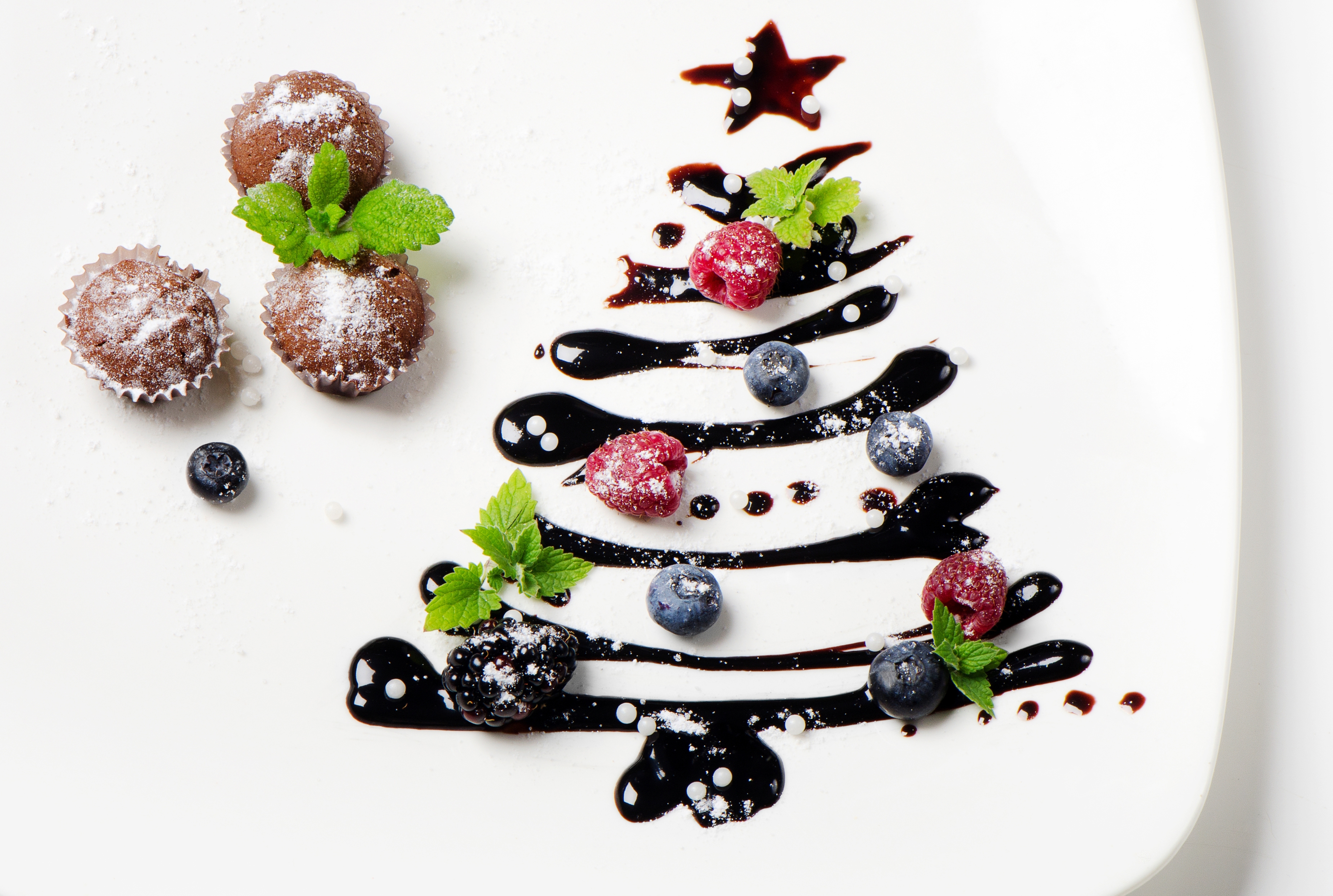 Description: A white plate topped with a christmas tree shaped dessert next to berries and mint leaves on top of it.