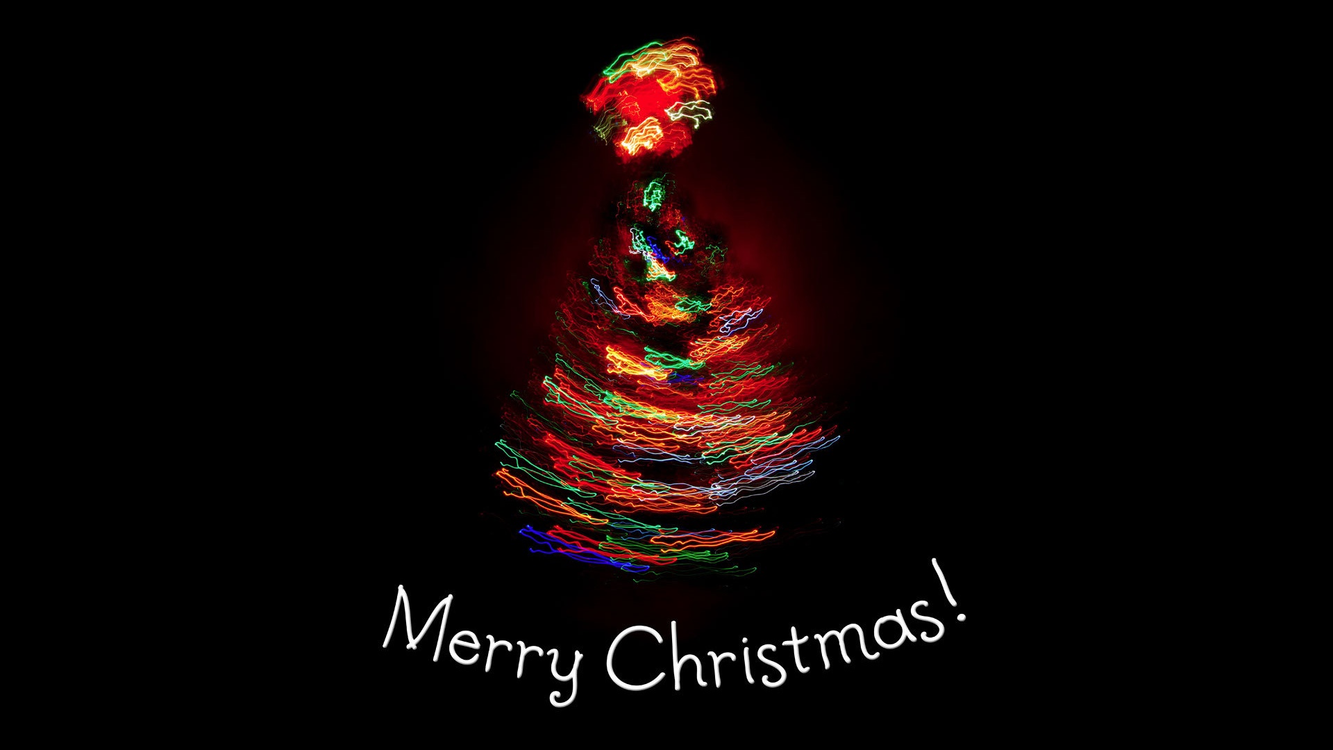 Description: A christmas tree with a merry message on it's side and a red light in the middle of the picture.