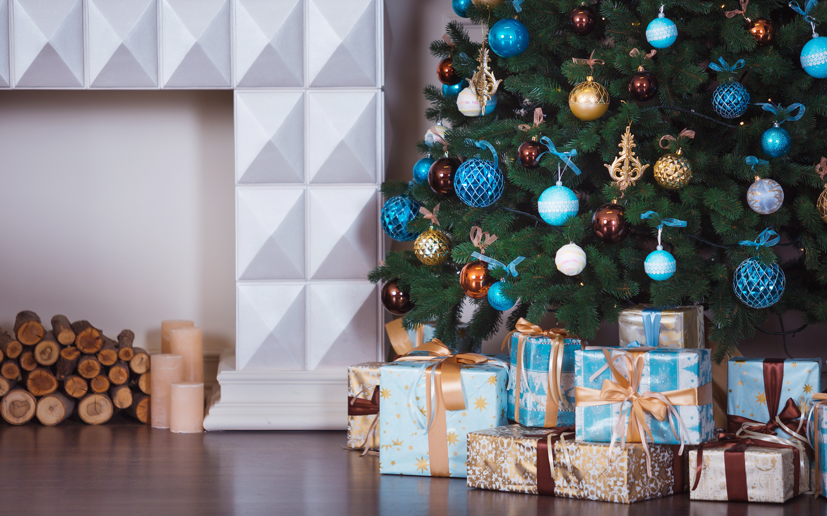 Description: A christmas tree with presents under it and a fireplace in the background with a fireplace mantel and a christmas tree.