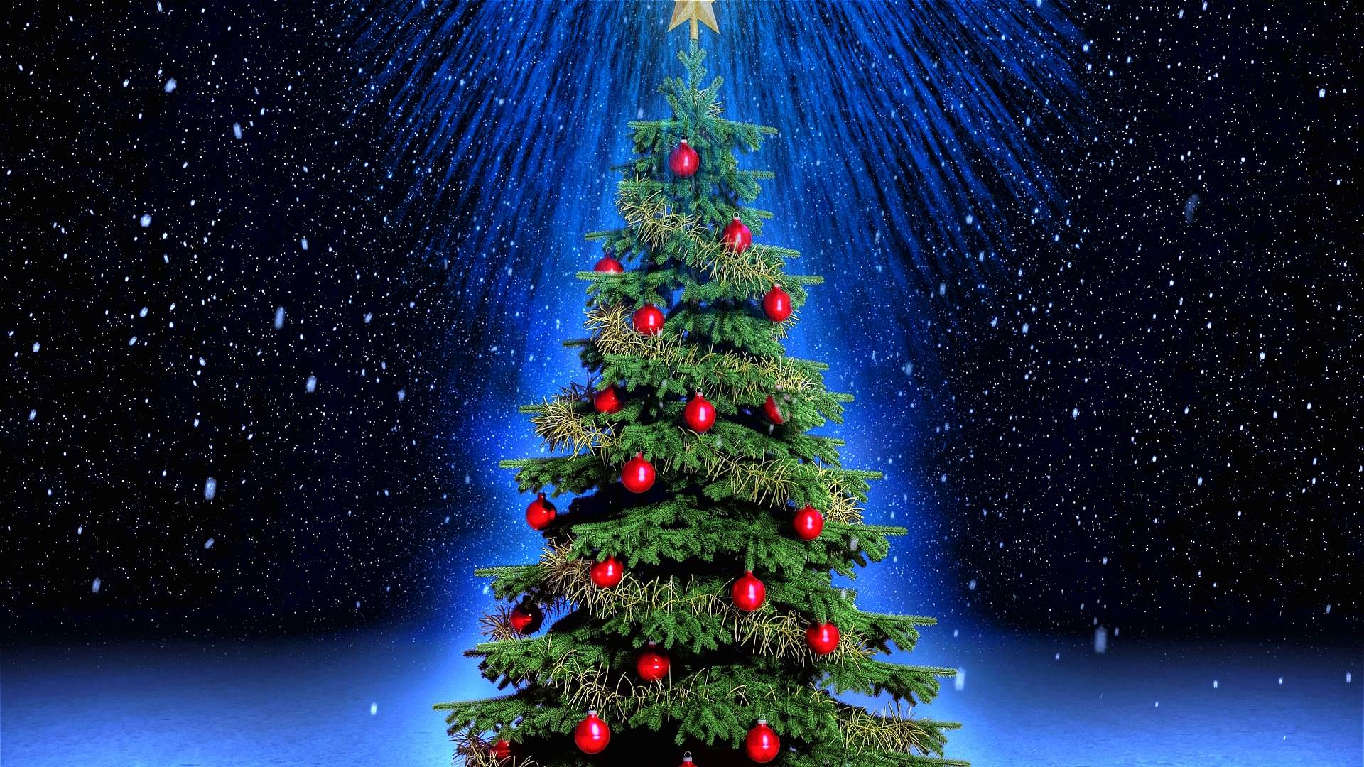 Description: A christmas tree with a star on top of it in the snow with a blue background and stars above it.