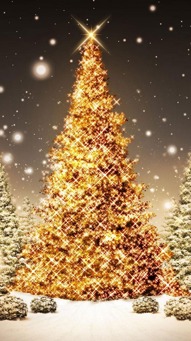 Description: A christmas tree with a star on top of it in the snow with snowflakes on the ground.