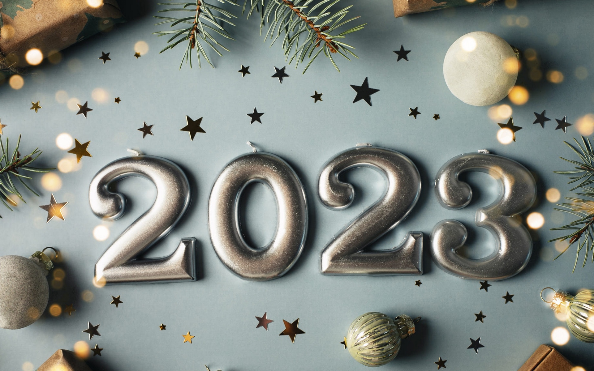 Description: A number of balloons and decorations on a blue background with stars and lights around them and a christmas tree.
