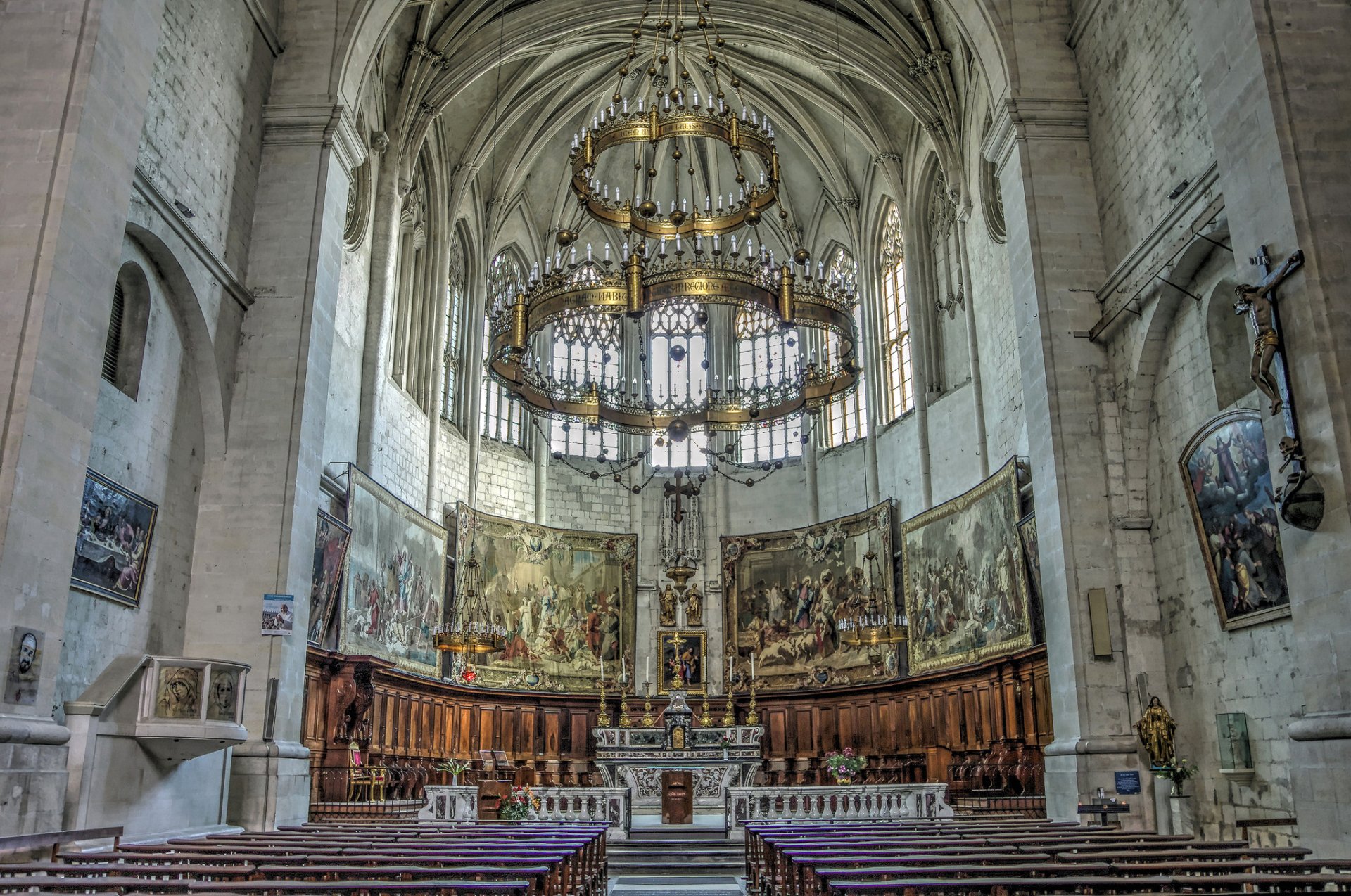Description: A church with a large chandelier and pews in it's center area with paintings on the walls.