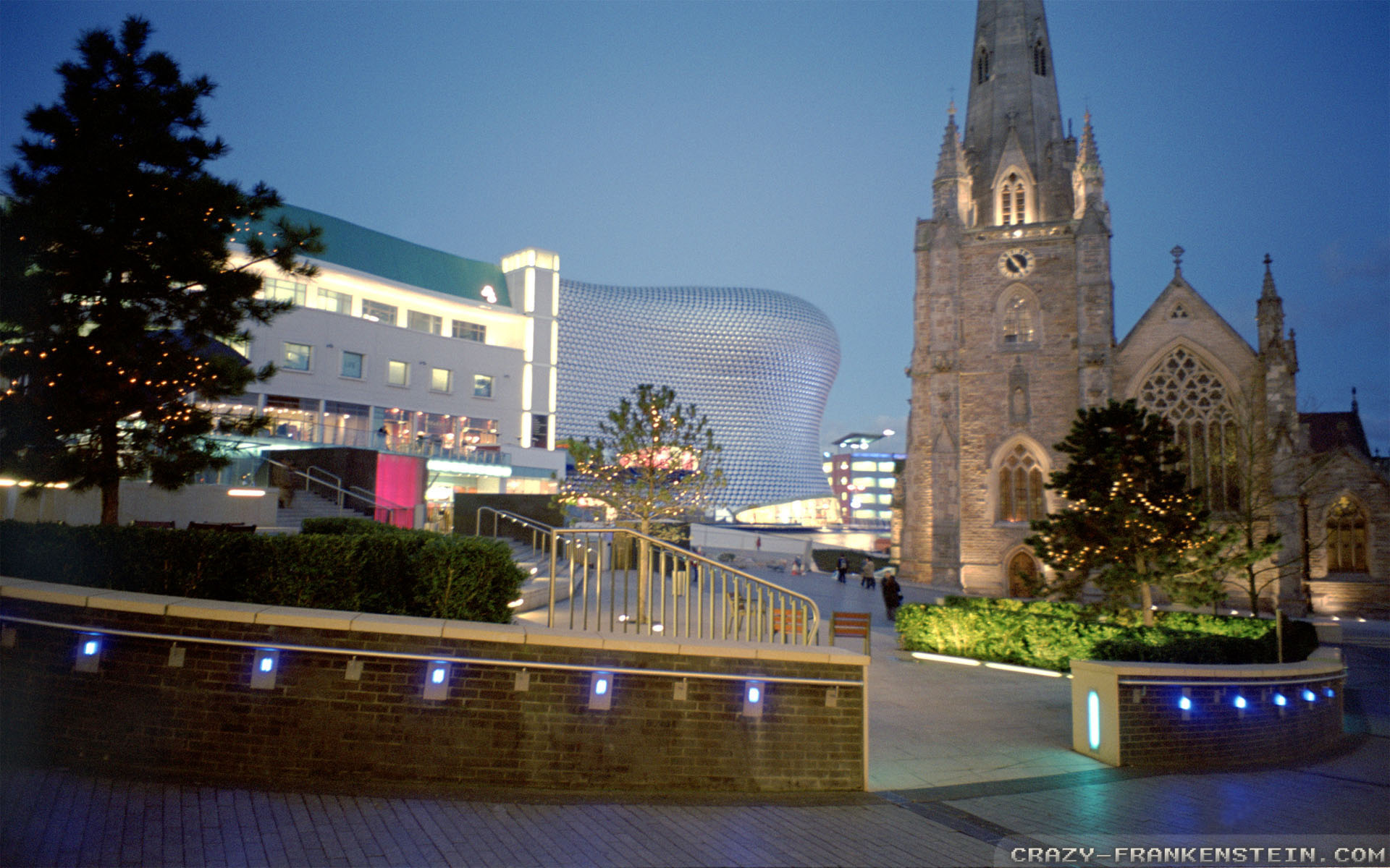Description: A church with a clock tower and a lit up walkway in front of it at night time with lights on.
