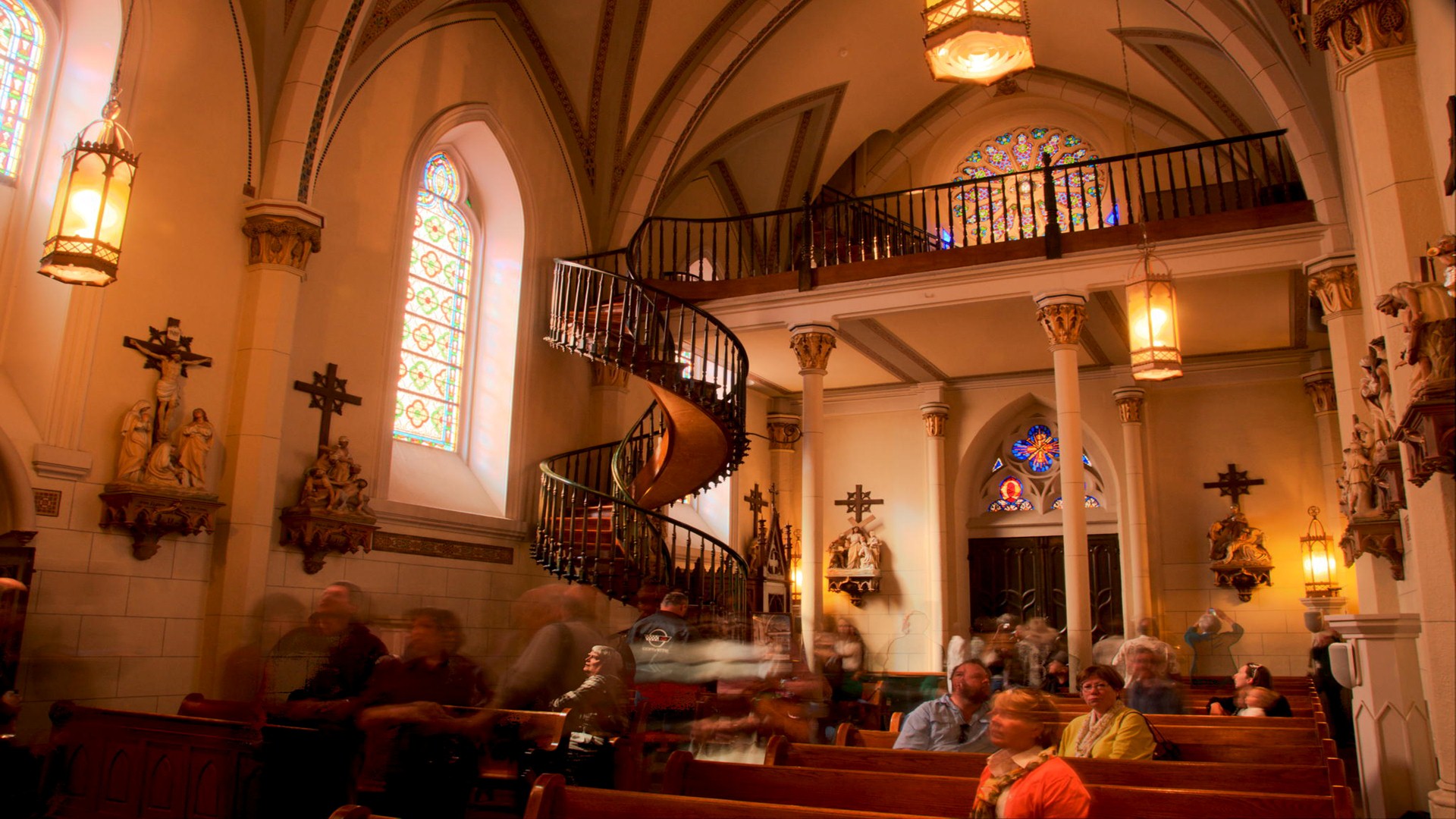 Description: A church with a lot of people inside of it and a spiral staircase leading up to the second floor.