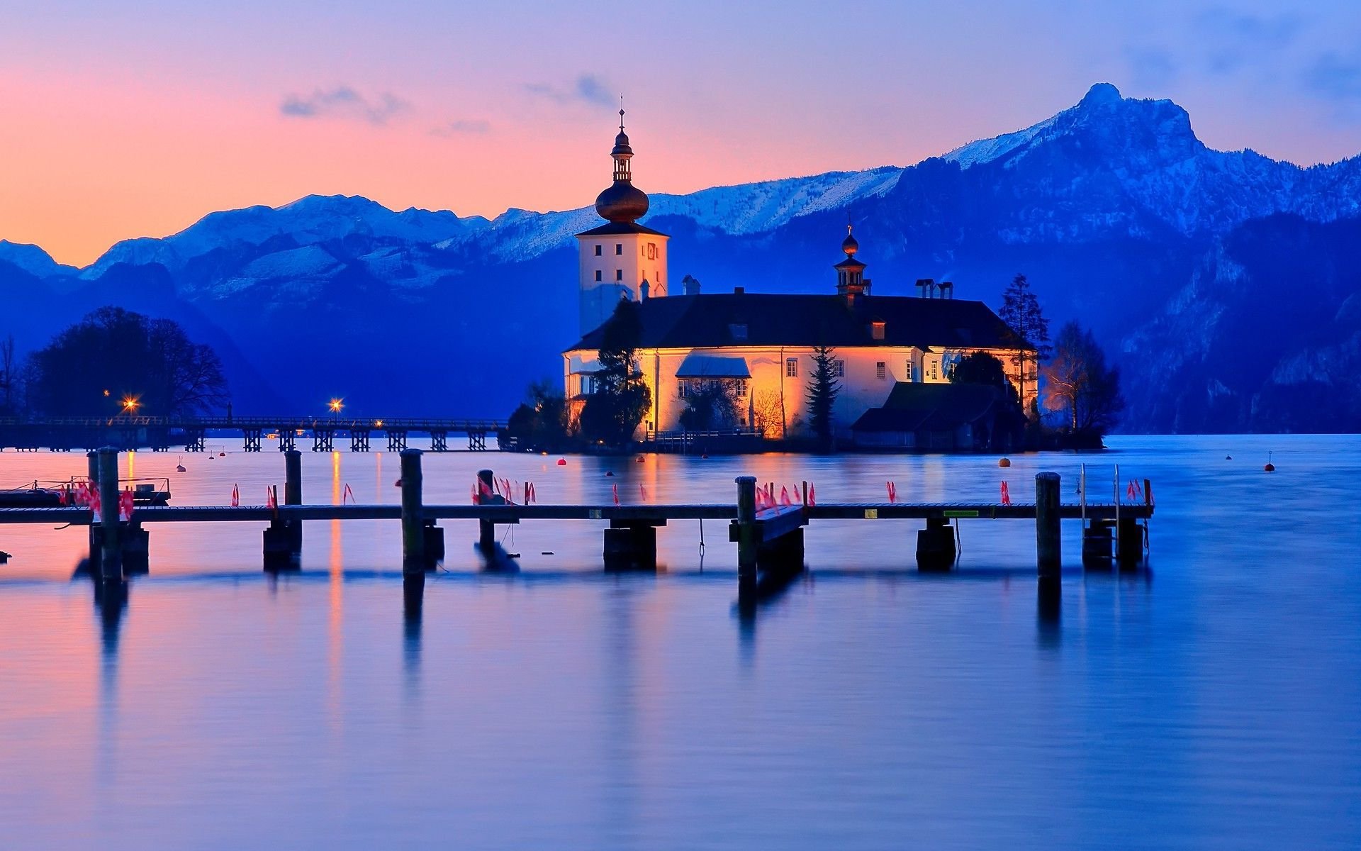 Description: A church on a lake with mountains in the background at sunset with a boat in the water and a dock in front of it.