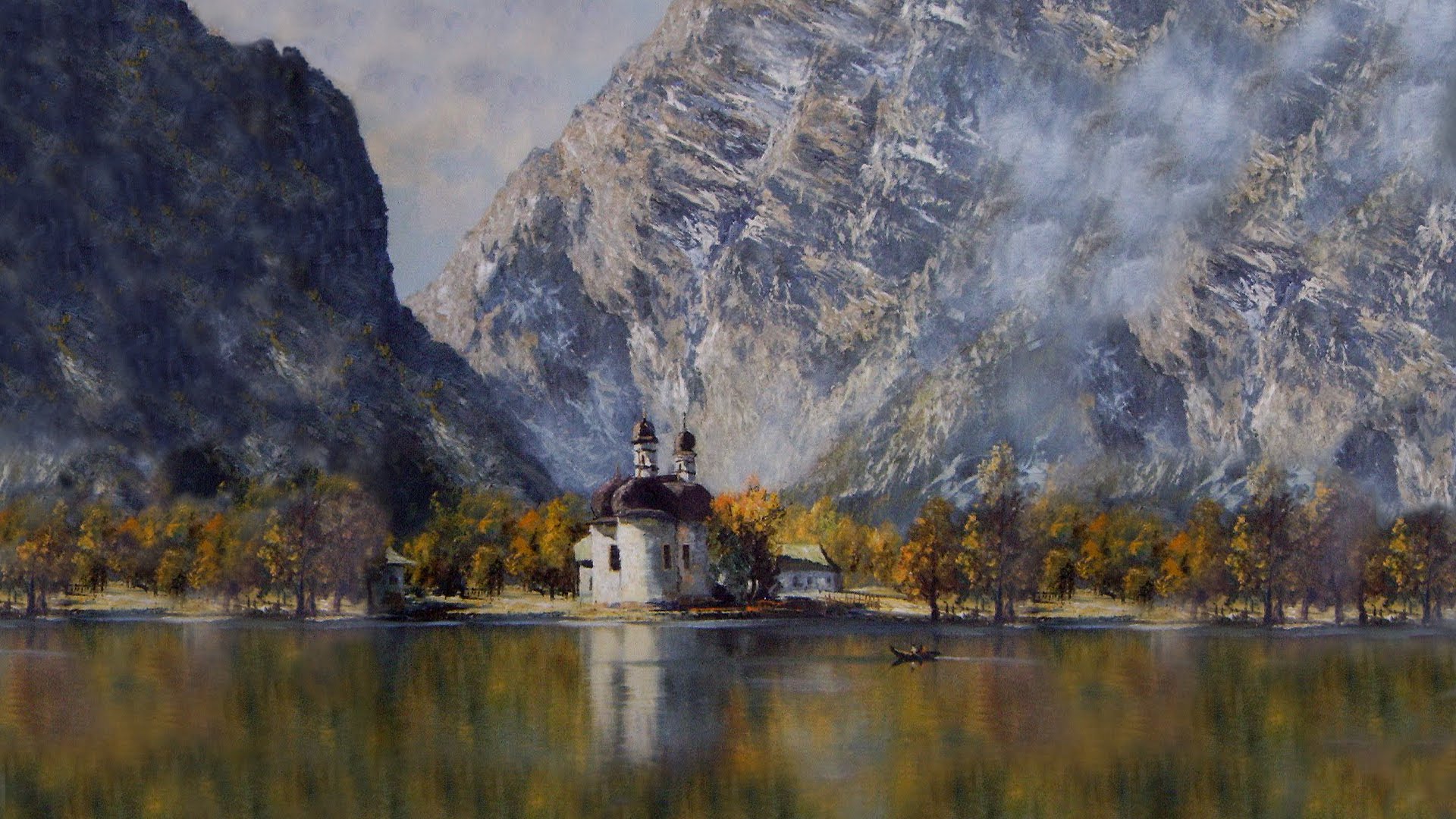 Description: A painting of a church in a mountain lake with a mountain range in the background and a lake below.