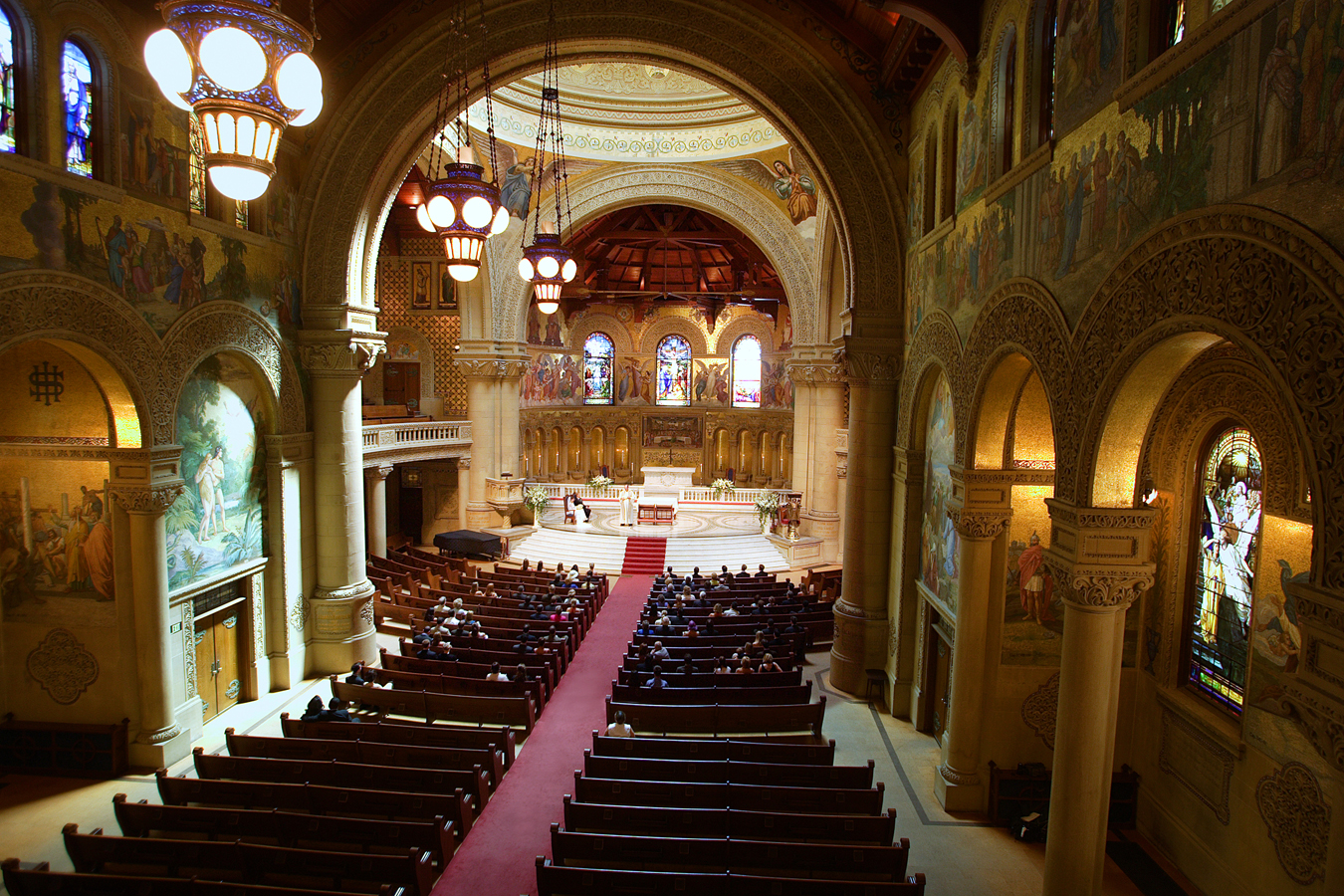 Description: A church with a red carpet and a red carpeted aisle leading to the alter of the church with stained glass windows.