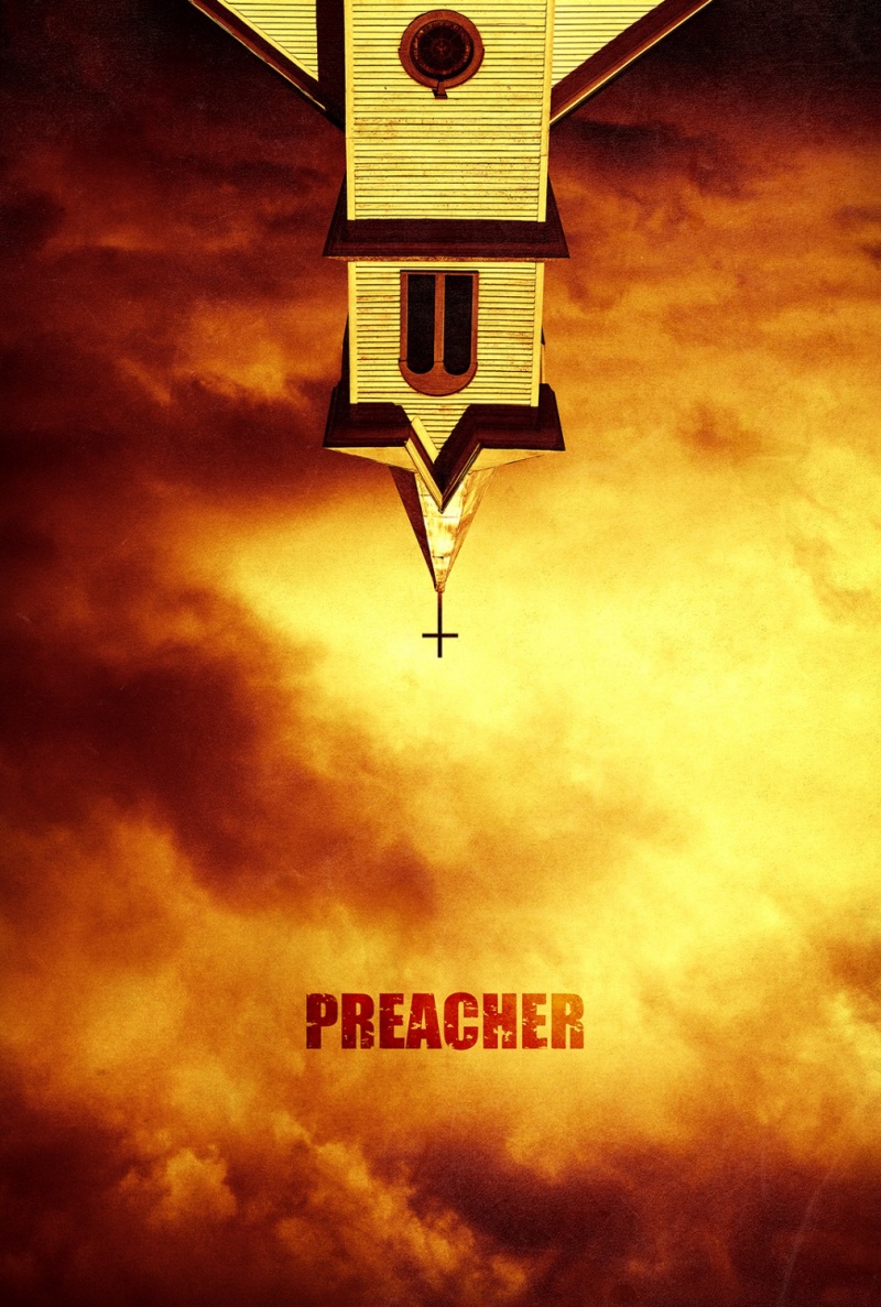 Description: A church steeple with a cross on it and a sky background with clouds in the background with a word written below it.