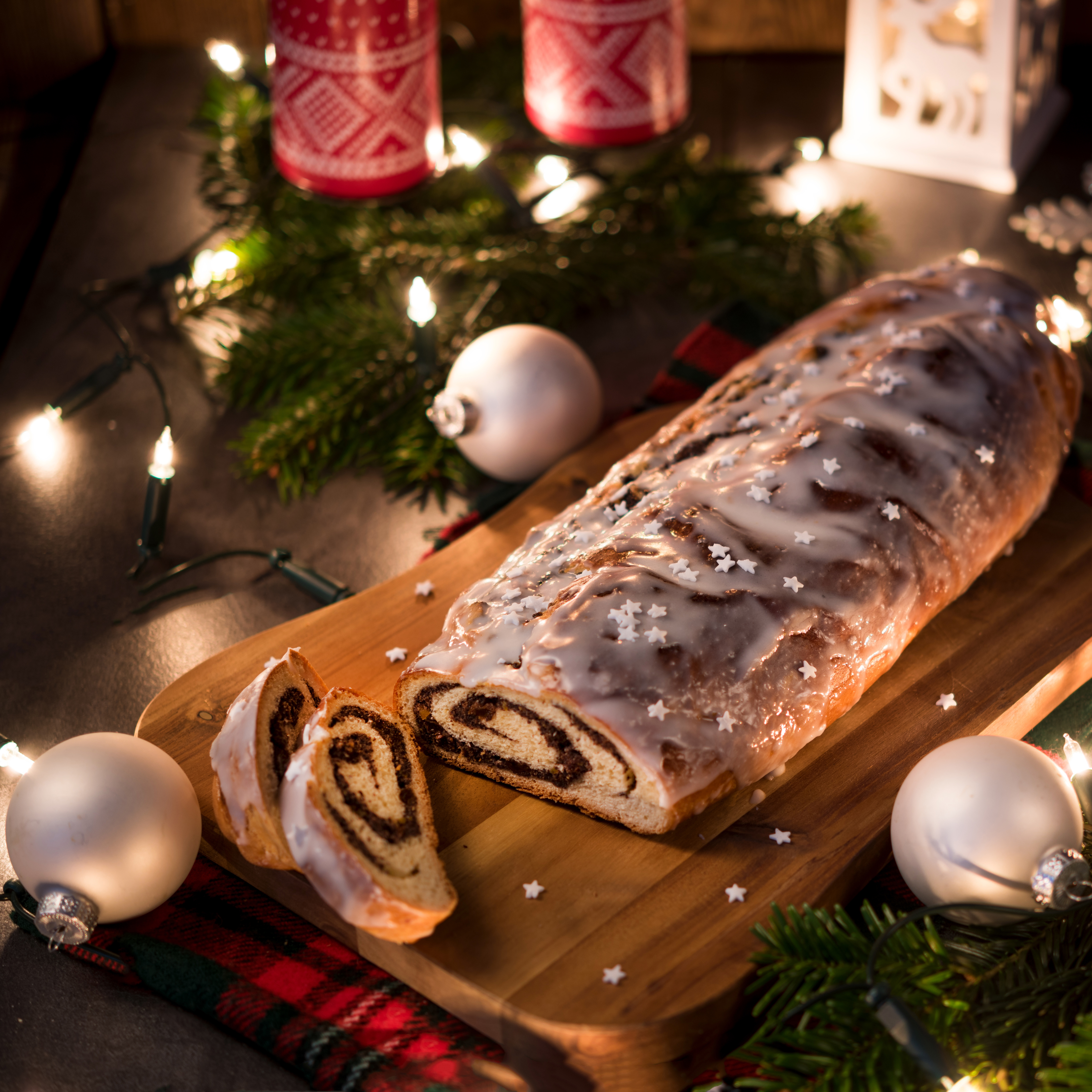 Description: A loaf of cinnamon roll on a wooden cutting board with christmas decorations around it and candles in the background.