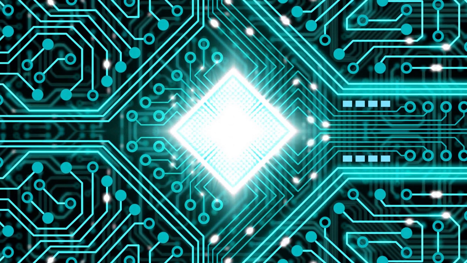 Description: A computer circuit board with a blue light shining through it and a white diamond in the center of the board.