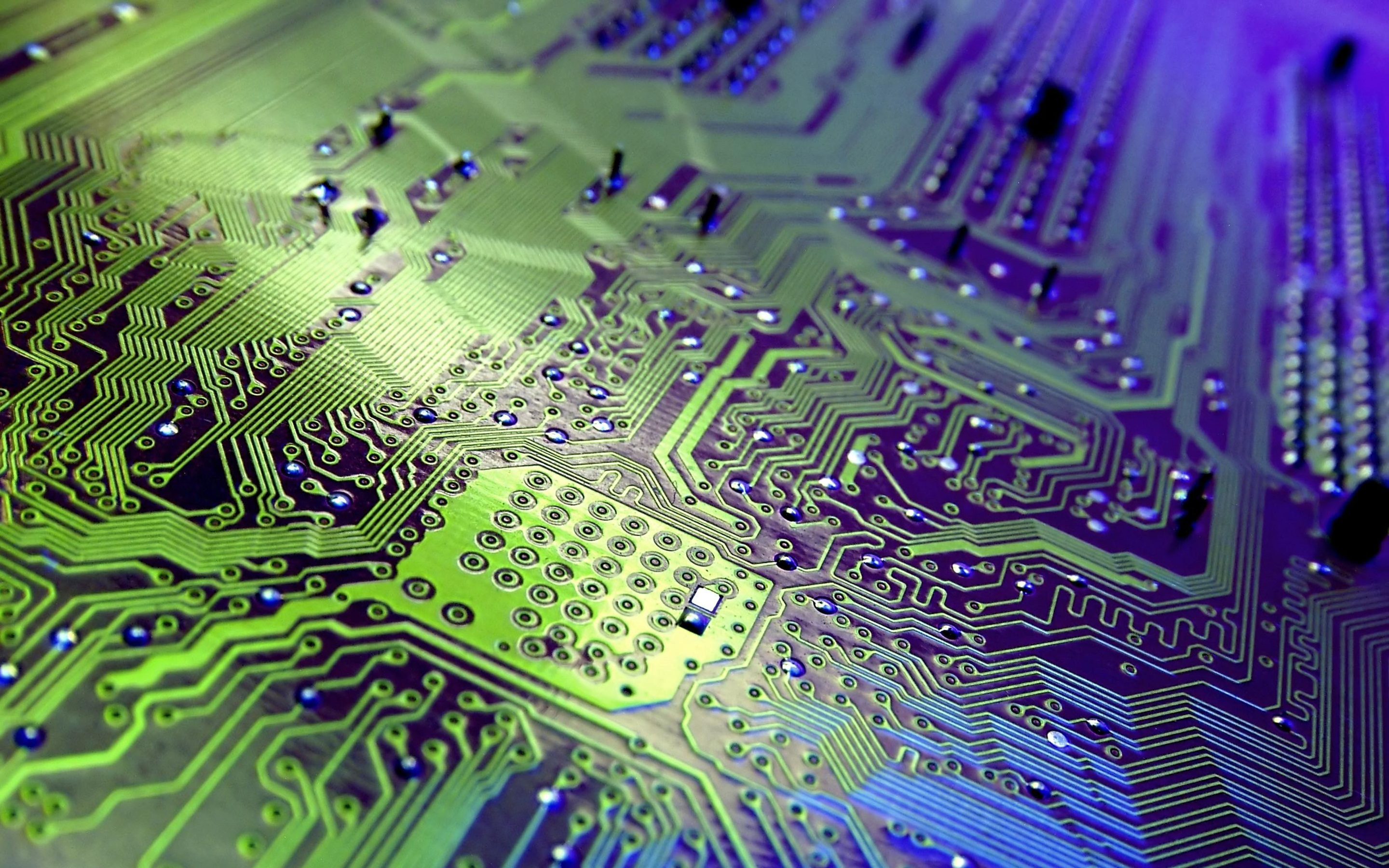 Description: A close up of a computer circuit board with water droplets on it's surface and a purple background.