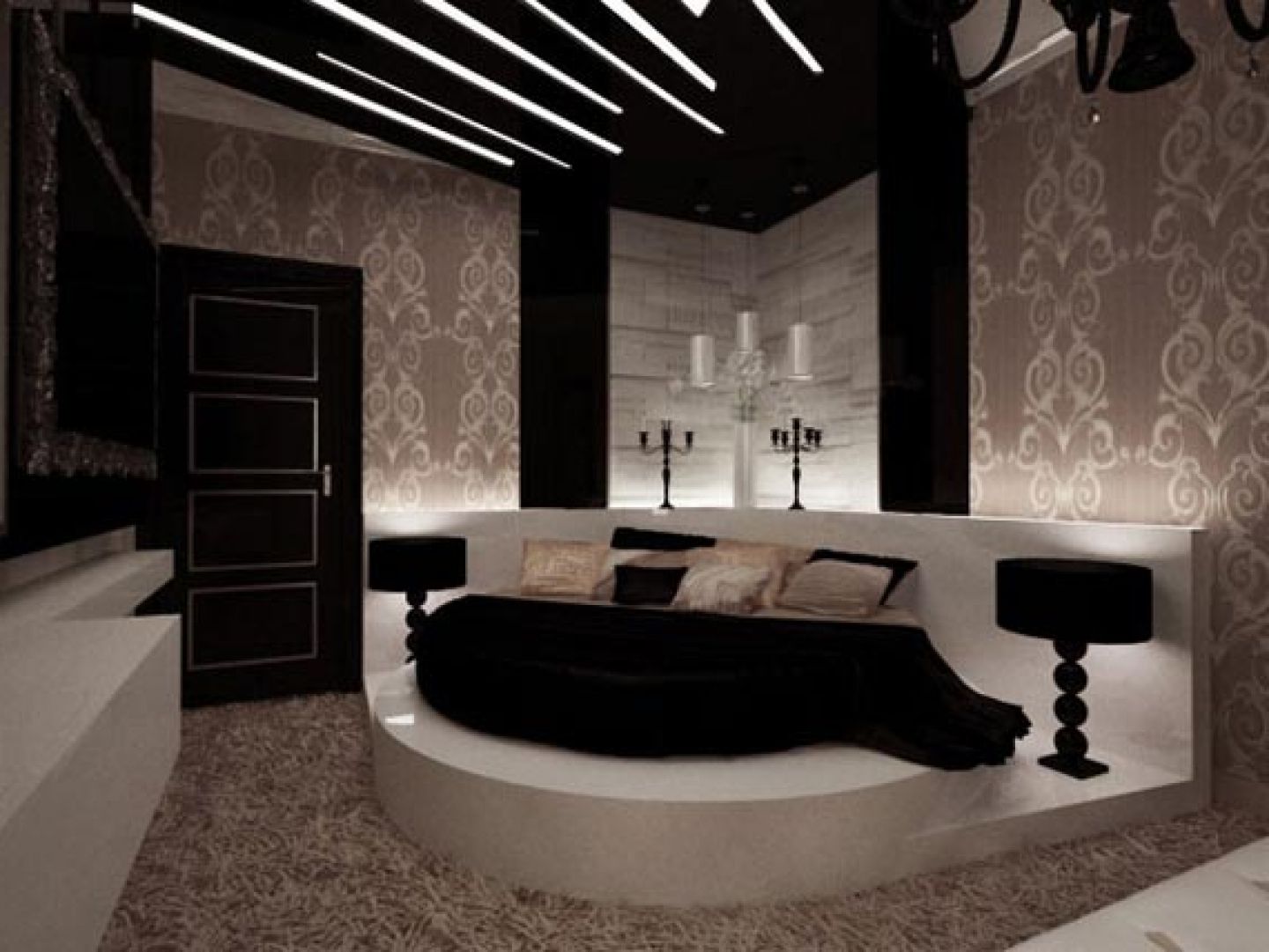Description: A bedroom with a circular bed and a chandelier hanging from the ceiling and a chandelier hanging from the ceiling.