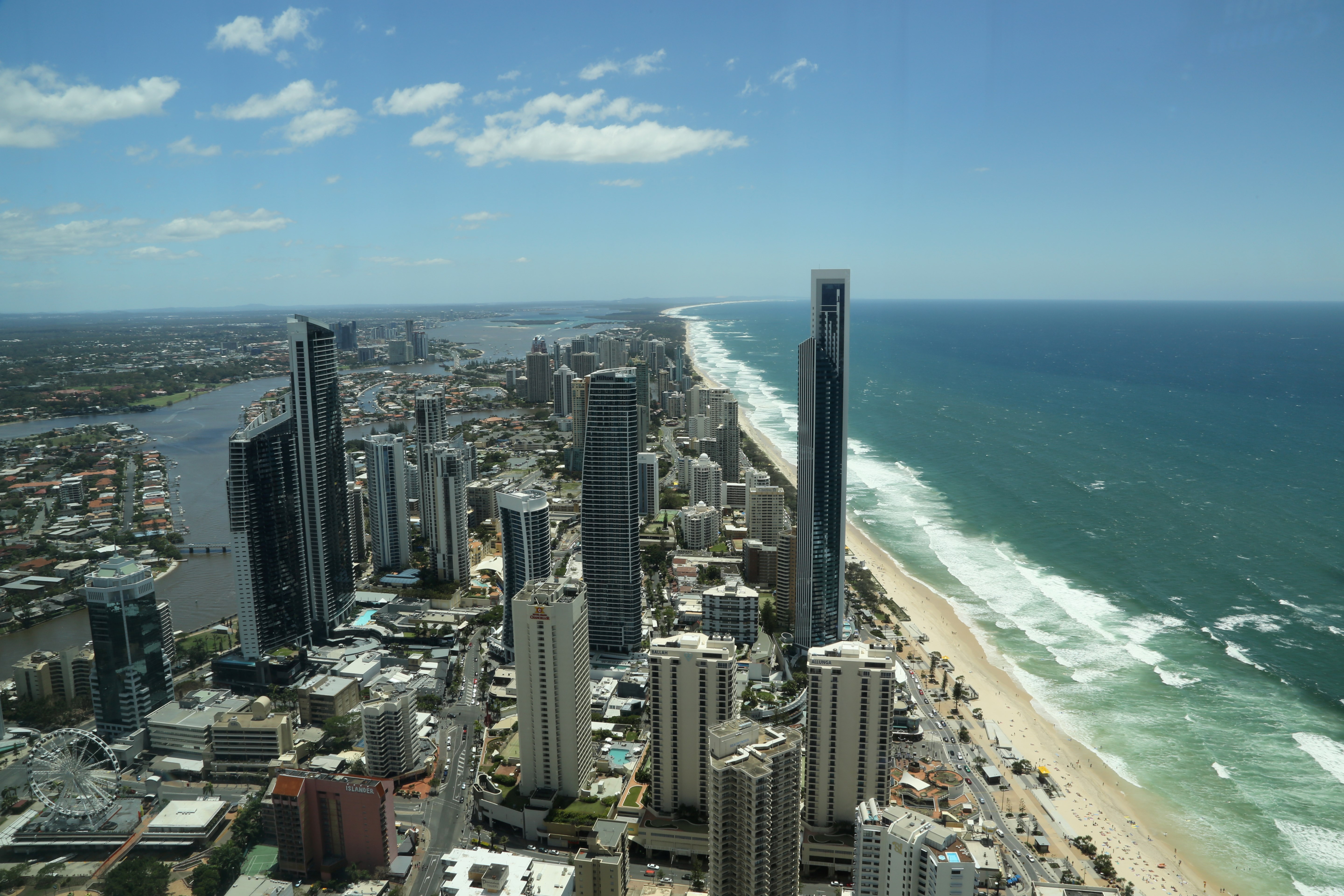 Description: A city with a beach and ocean in the background and a blue sky with clouds in the background and a few buildings on the beach.