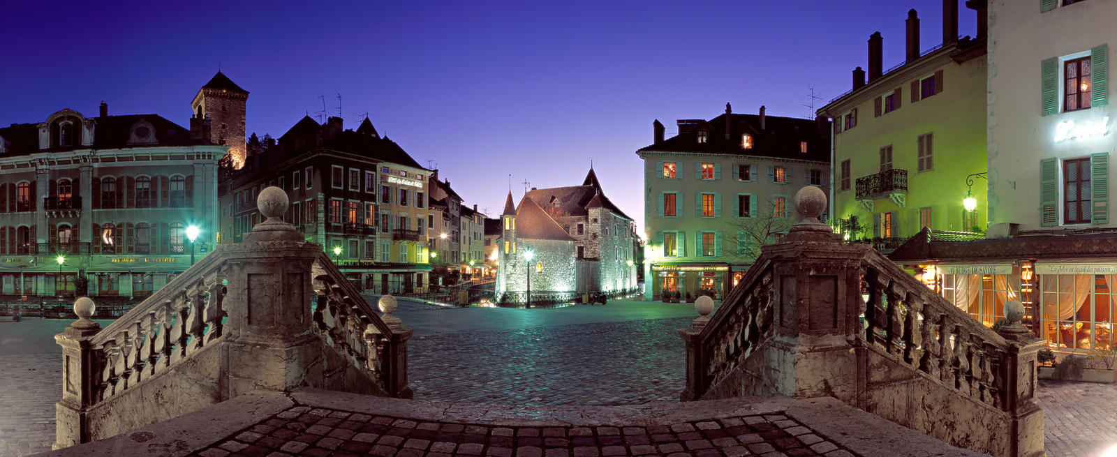 Description: A city street with a bridge and buildings at night time with lights on the buildings and a clock tower.