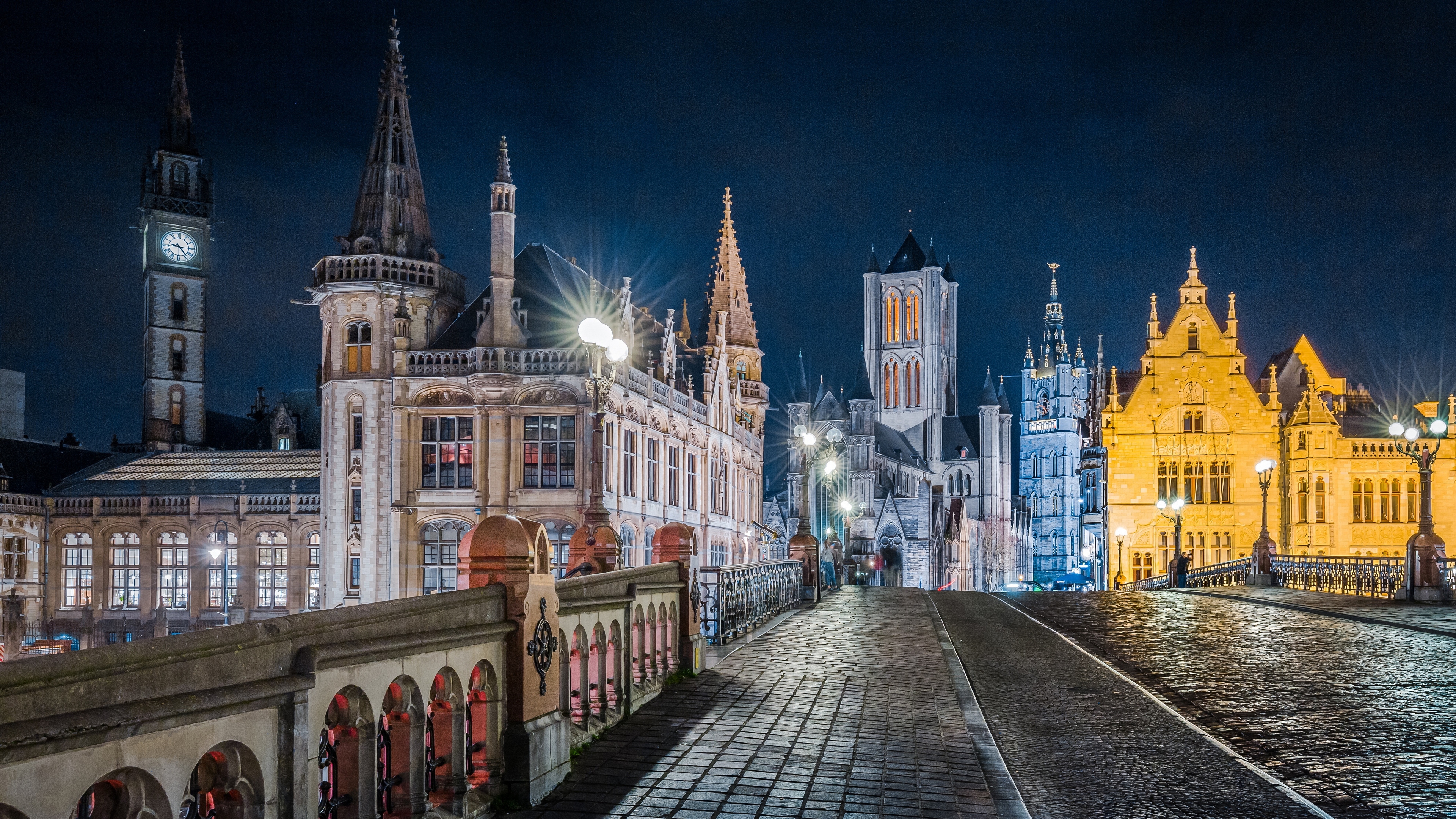 Description: A city street with a bridge and a clock tower in the background at night time with lights on and a few buildings lit up.