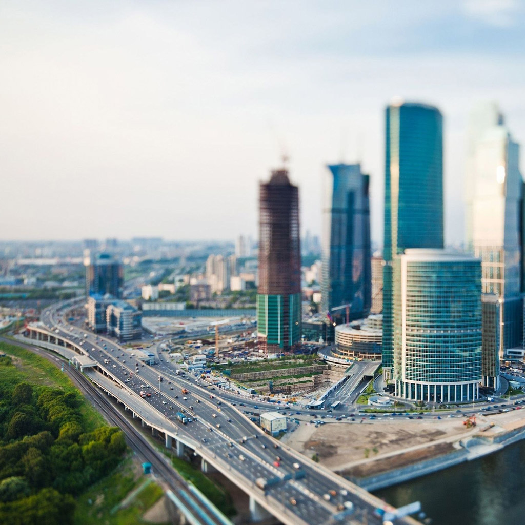 Description: A city with a bridge and a river in the foreground and a highway in the middle of the picture.