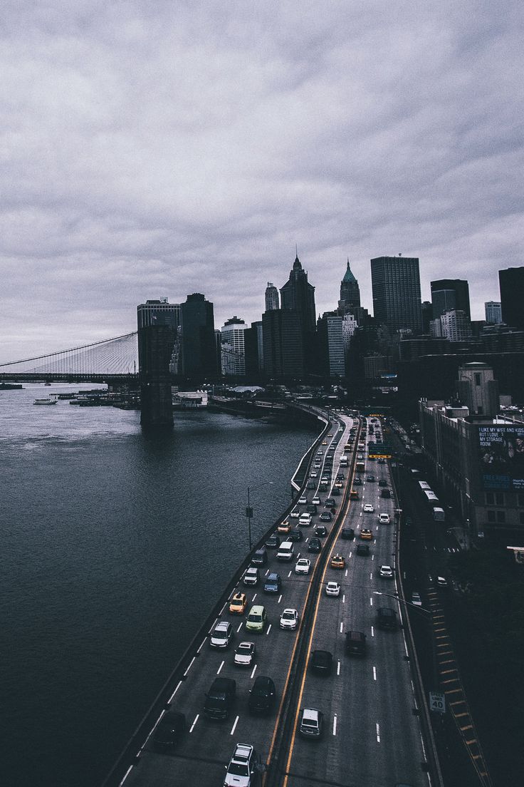 Description: A view of a city with a bridge and a river in the background and cars on the road below.