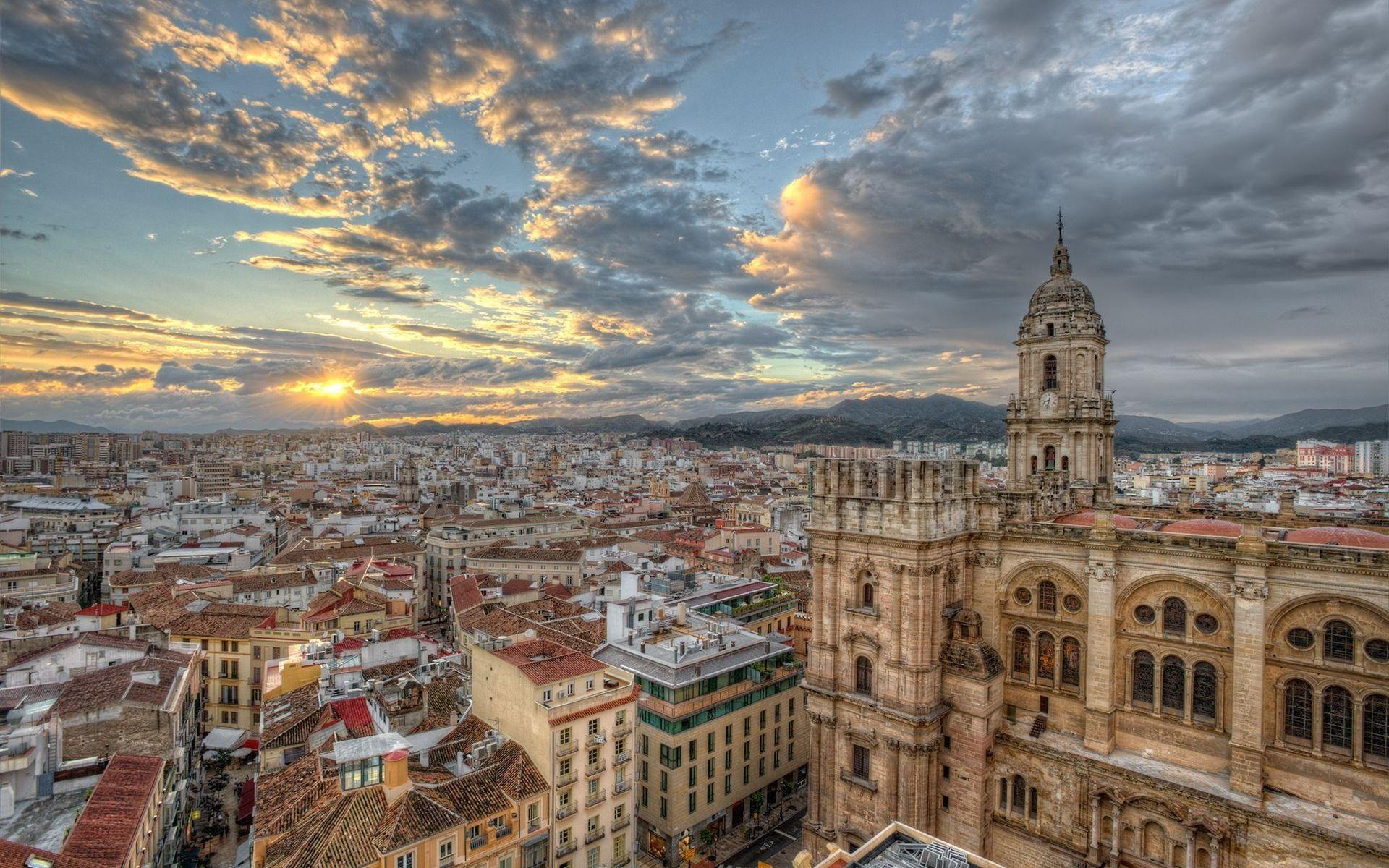 Description: A view of a city with a clock tower and a cloudy sky above it.