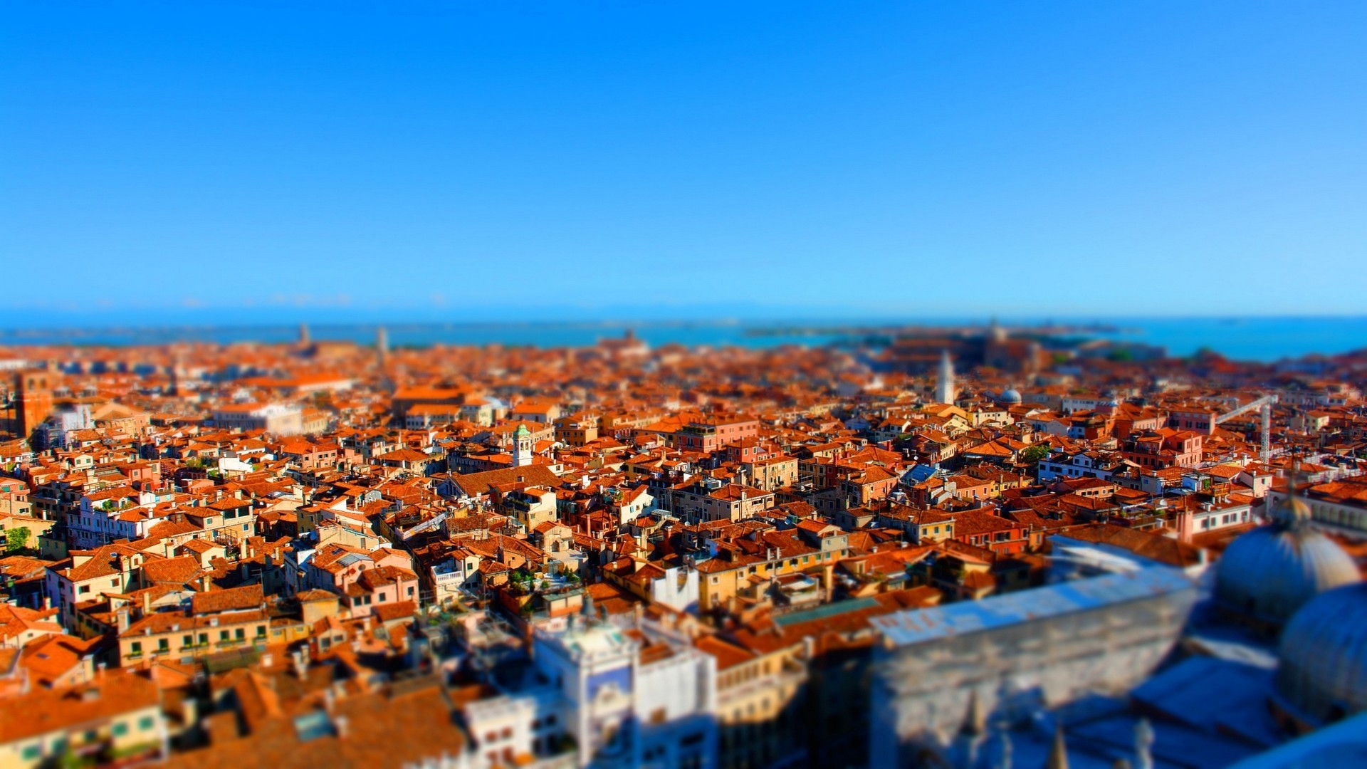 Description: A view of a city from a high point of view of a building and a clock tower in the distance.