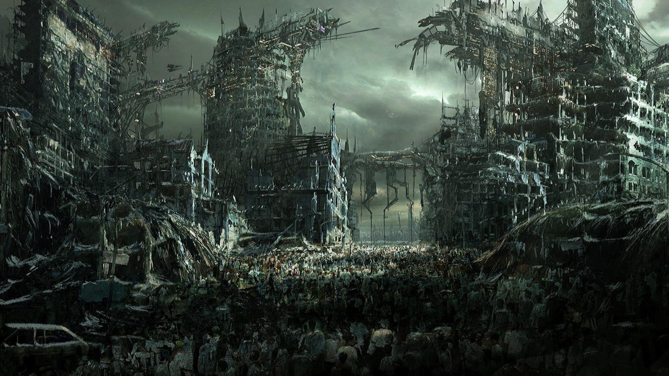 Description: A city with lots of people and a giant building with a giant clock tower in the middle of it.