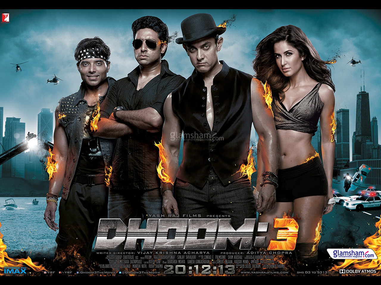 Description: A poster of a group of people in a city with flames in the background of the poster.
