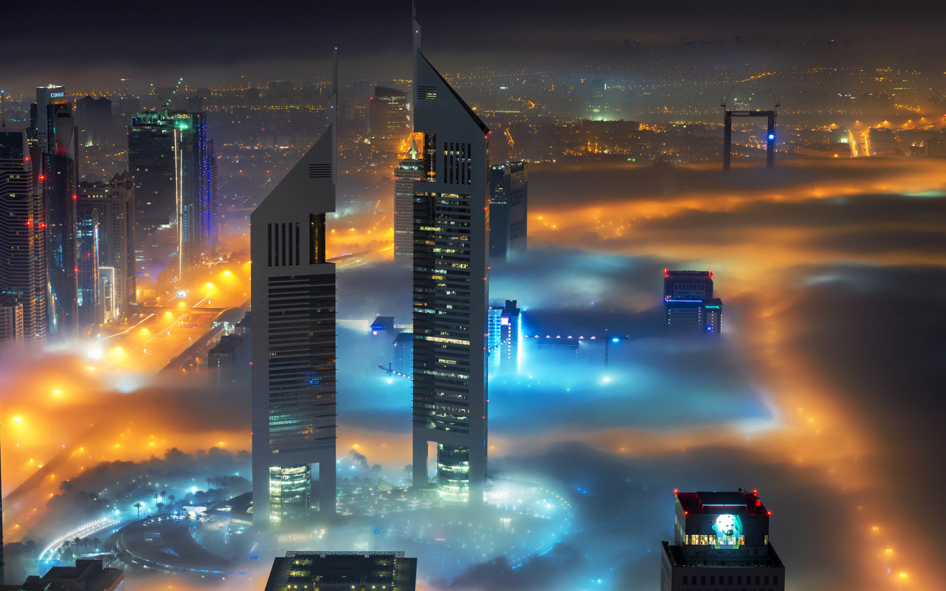 Description: A city with skyscrapers and fog in the night sky with lights on them and a fog bank below.