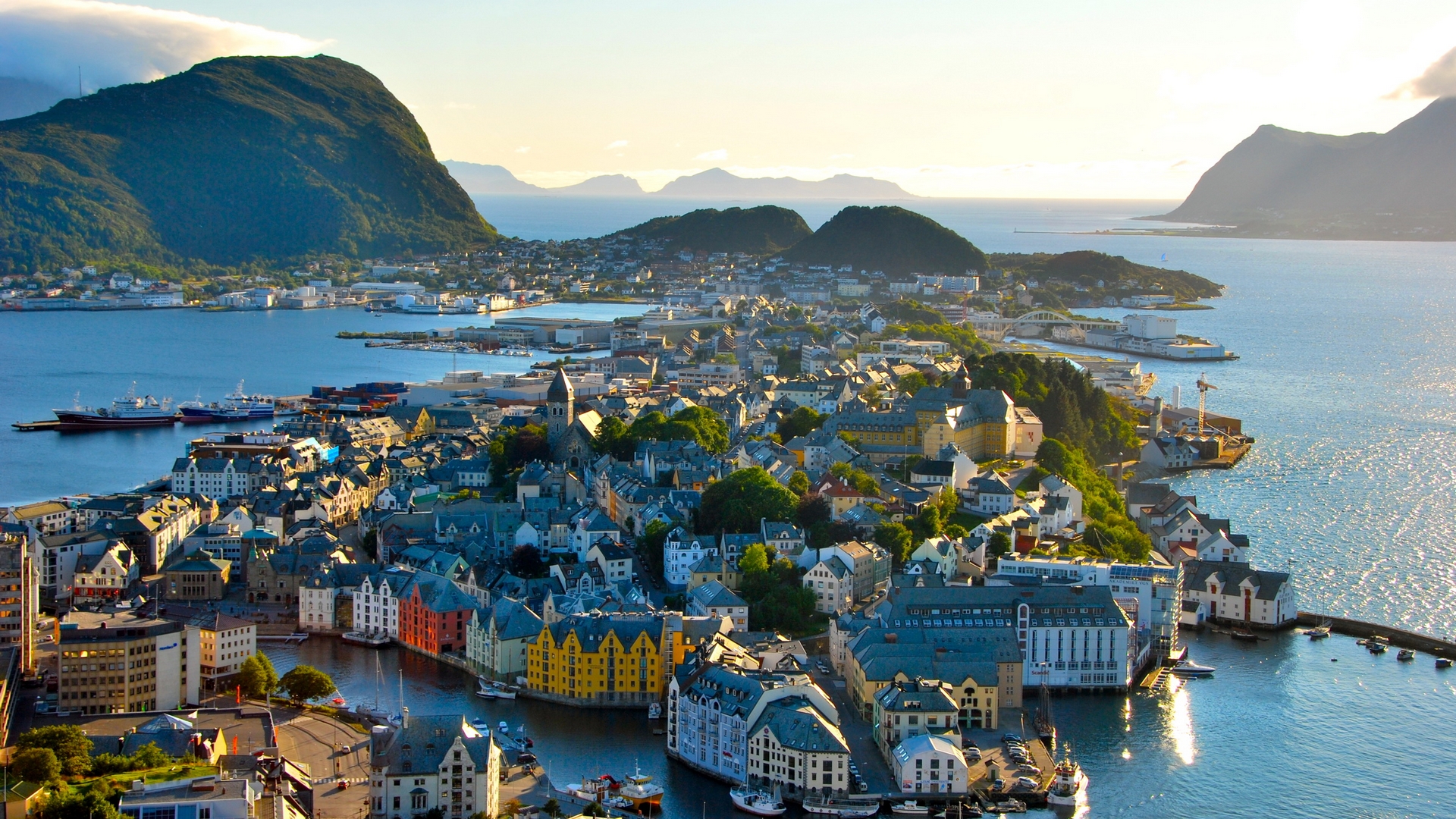 Description: A city with a harbor and mountains in the background at sunset or sunrise or sunset.