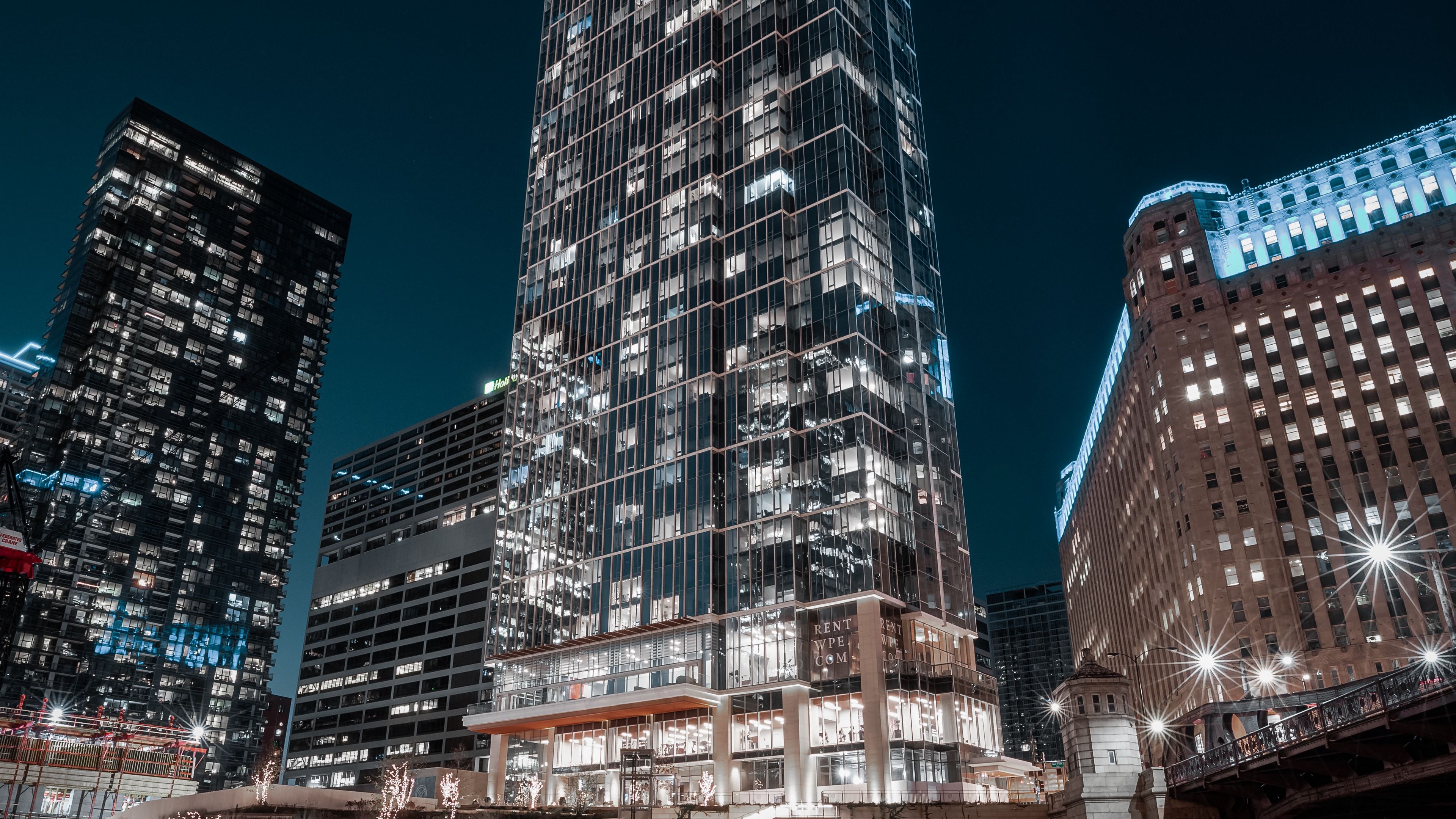 Description: A city at night with a lot of lights on it and a bridge in the foreground and a bridge in the foreground.