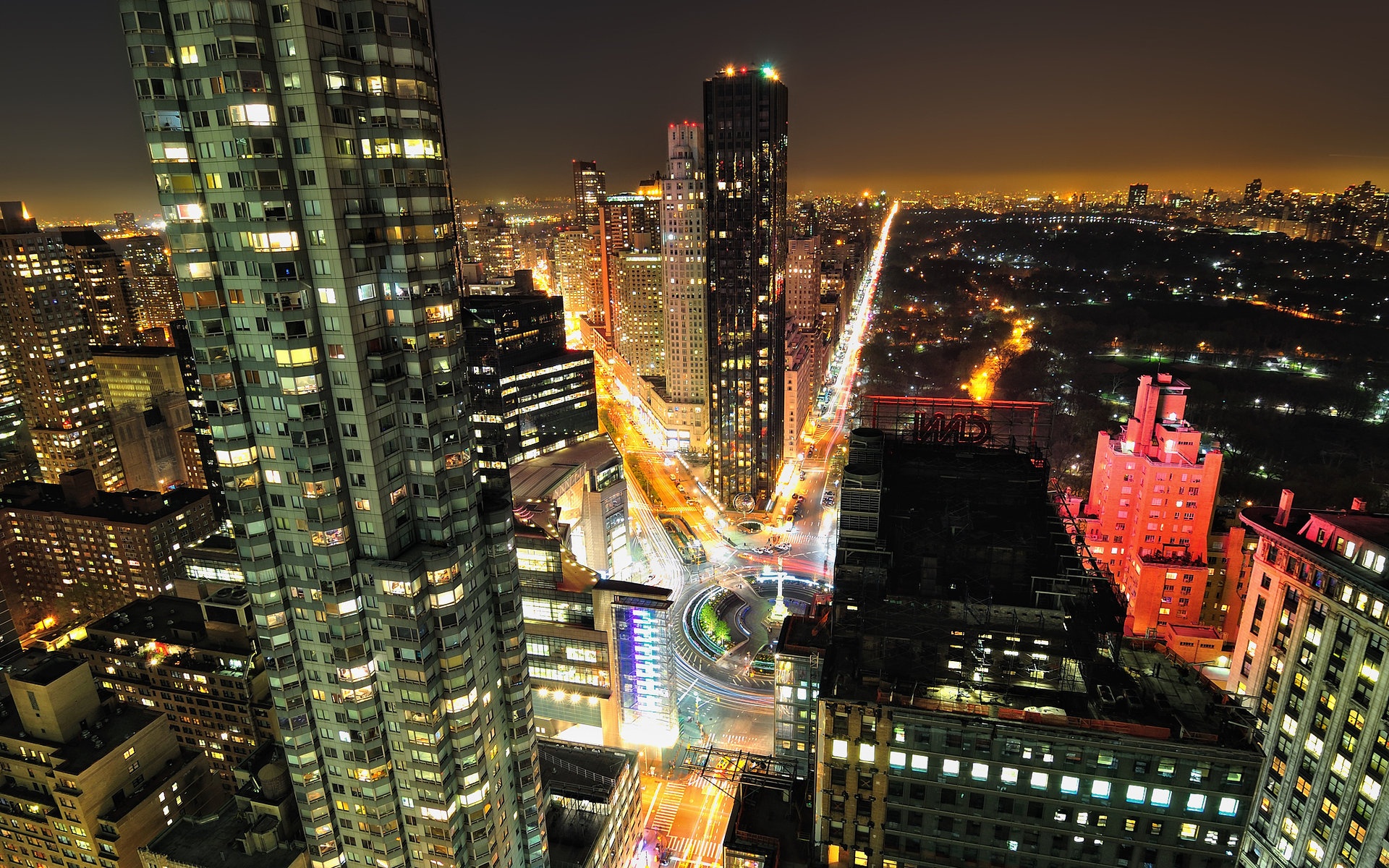 Description: A city at night with a lot of lights on it and a lot of tall buildings in the background.