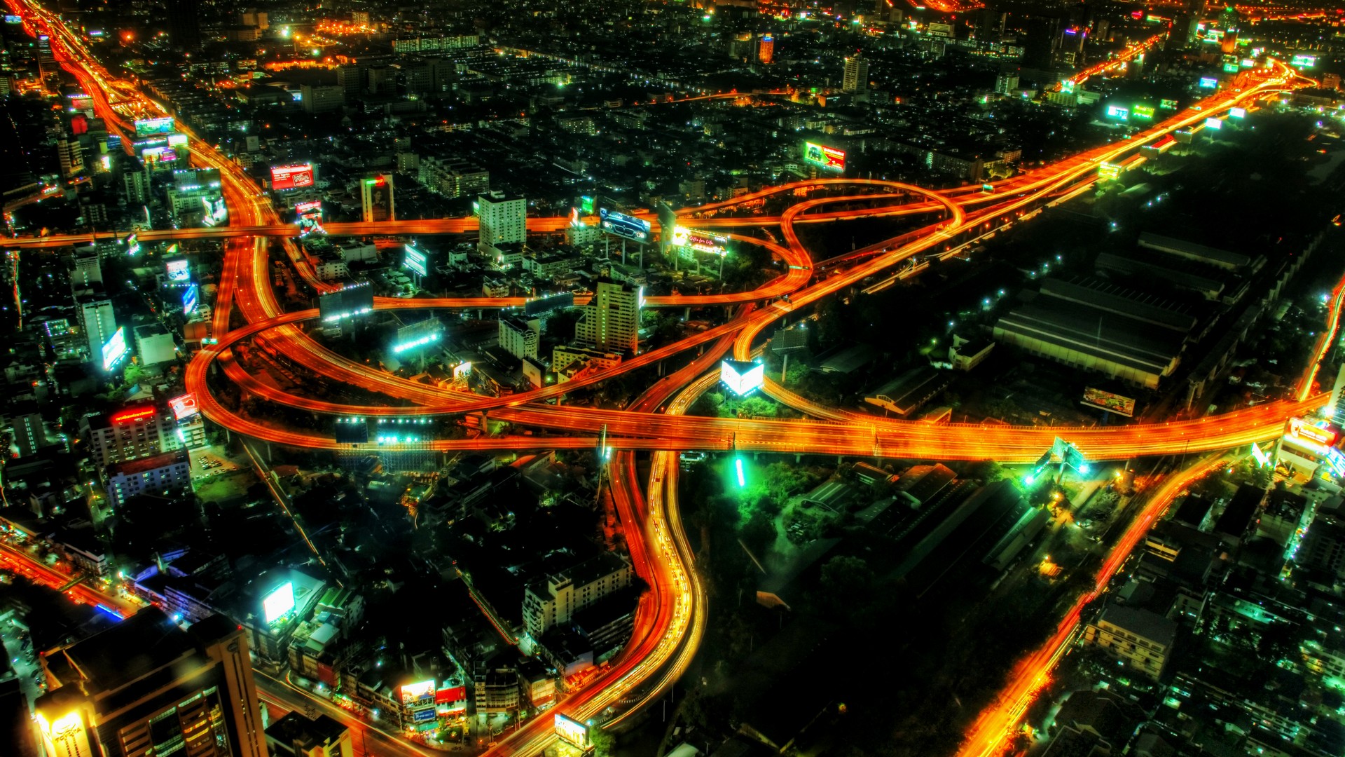 Description: A city at night with a lot of traffic and lights on it's streets and roads and streets.
