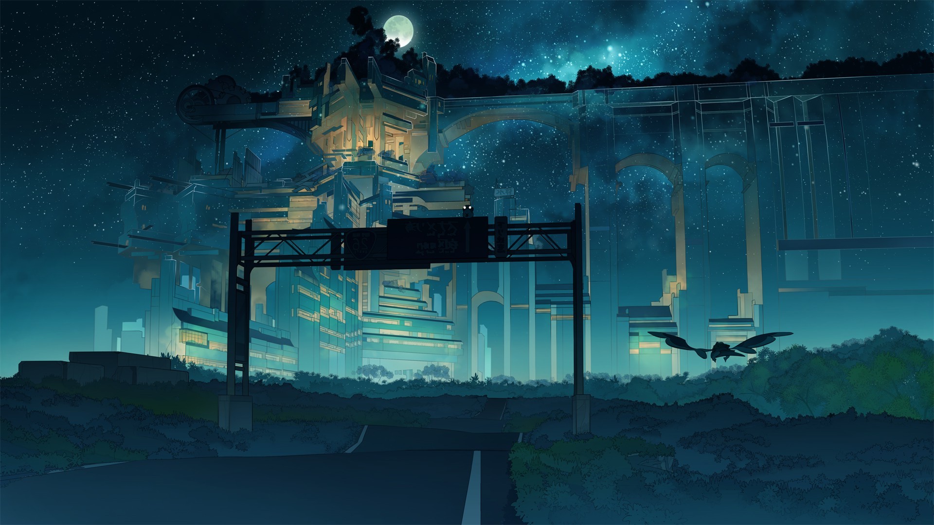 Description: A painting of a city at night with a bird flying by it's gates and a building with a clock tower.