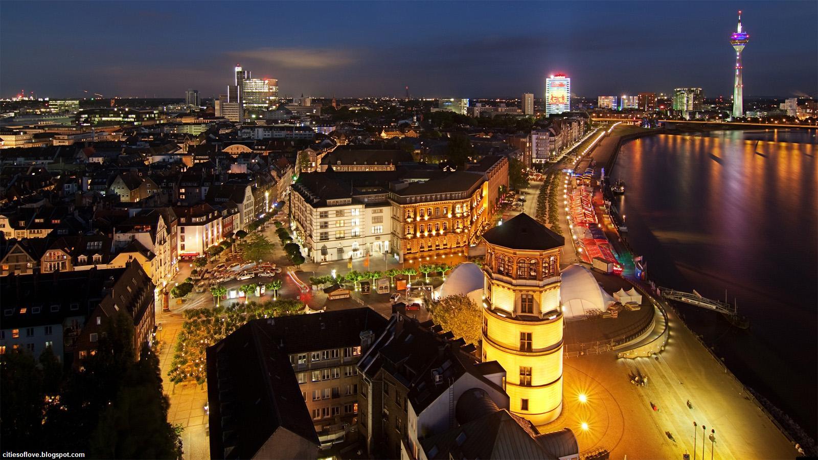 Description: A city at night with a clock tower in the middle of the city and a river running through it.