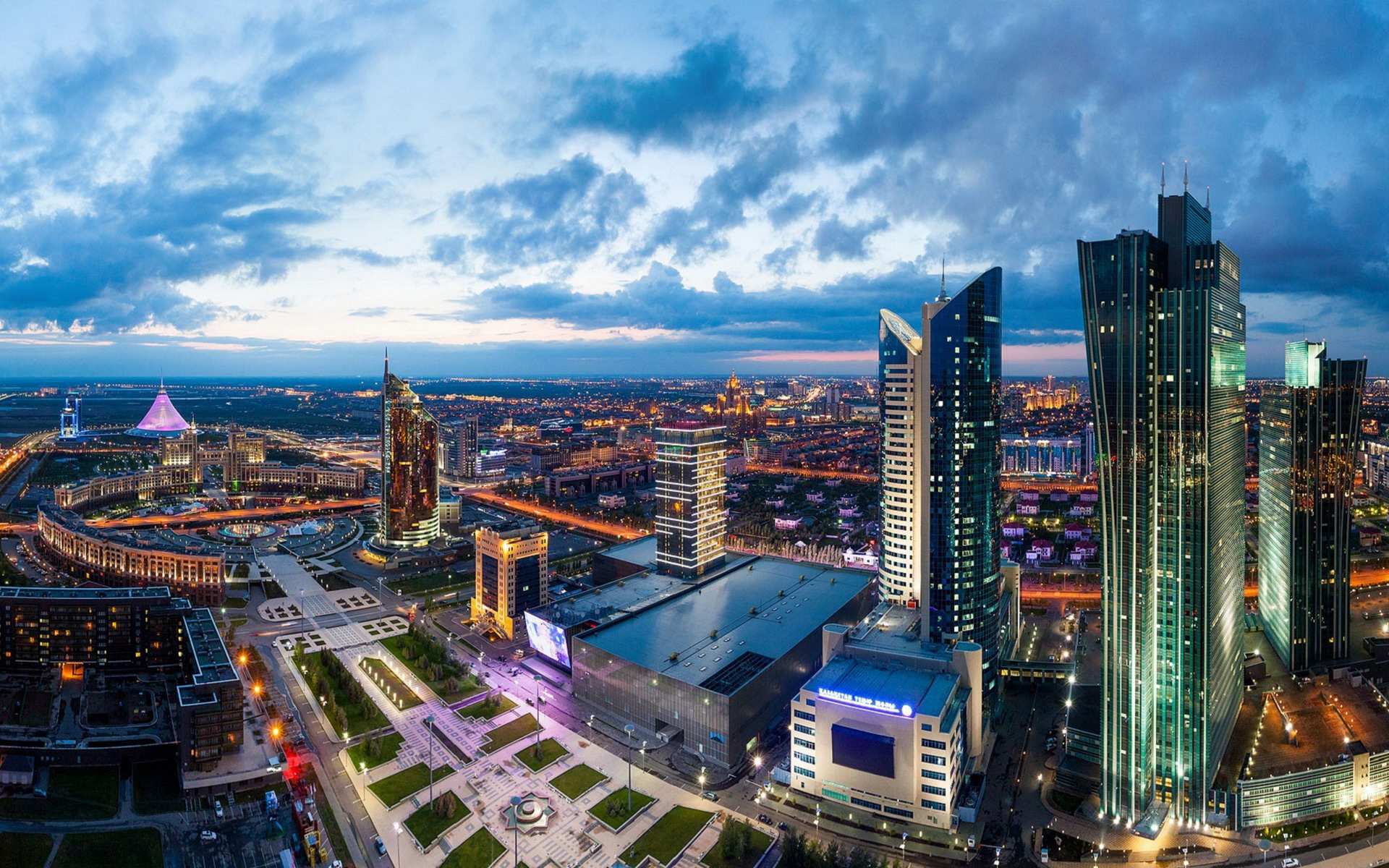 Description: A city at night with a lot of lights on it and a lot of buildings in the background with a cloudy sky.