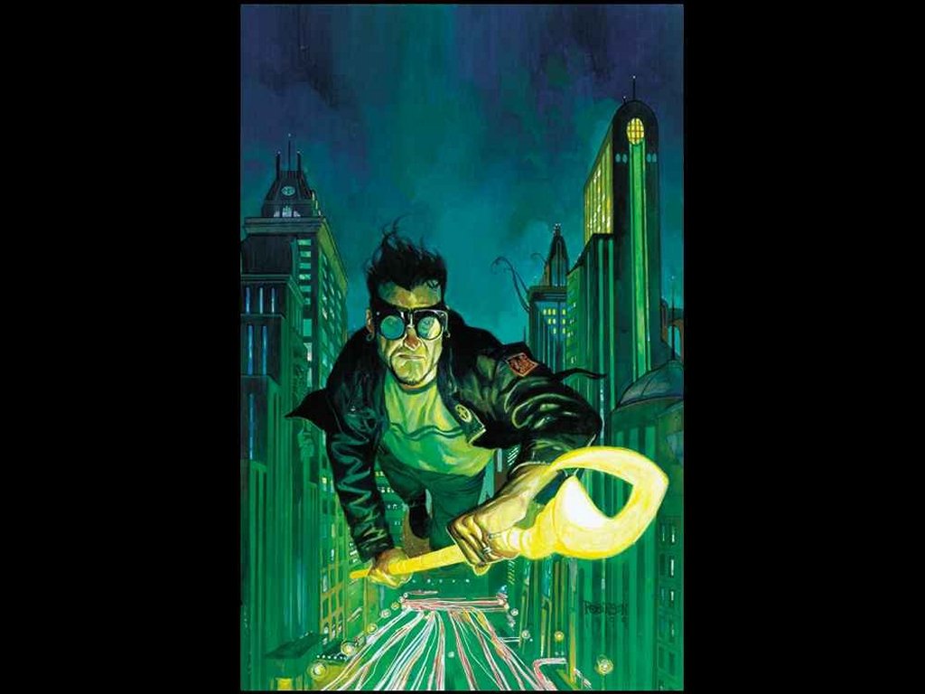 Description: A painting of a man holding a hammer in a city at night with a green background and a black jacket.