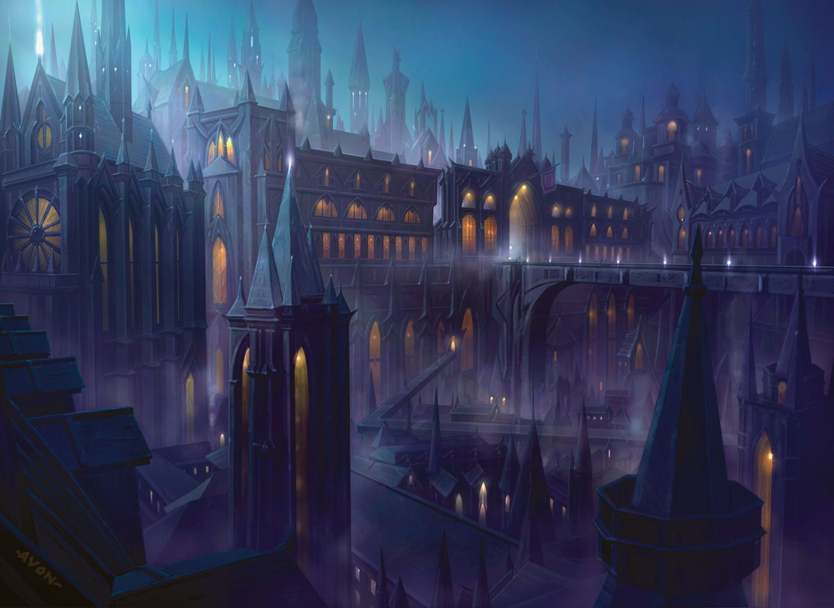 Description: A painting of a city at night with a bridge and buildings in the background and a foggy sky.
