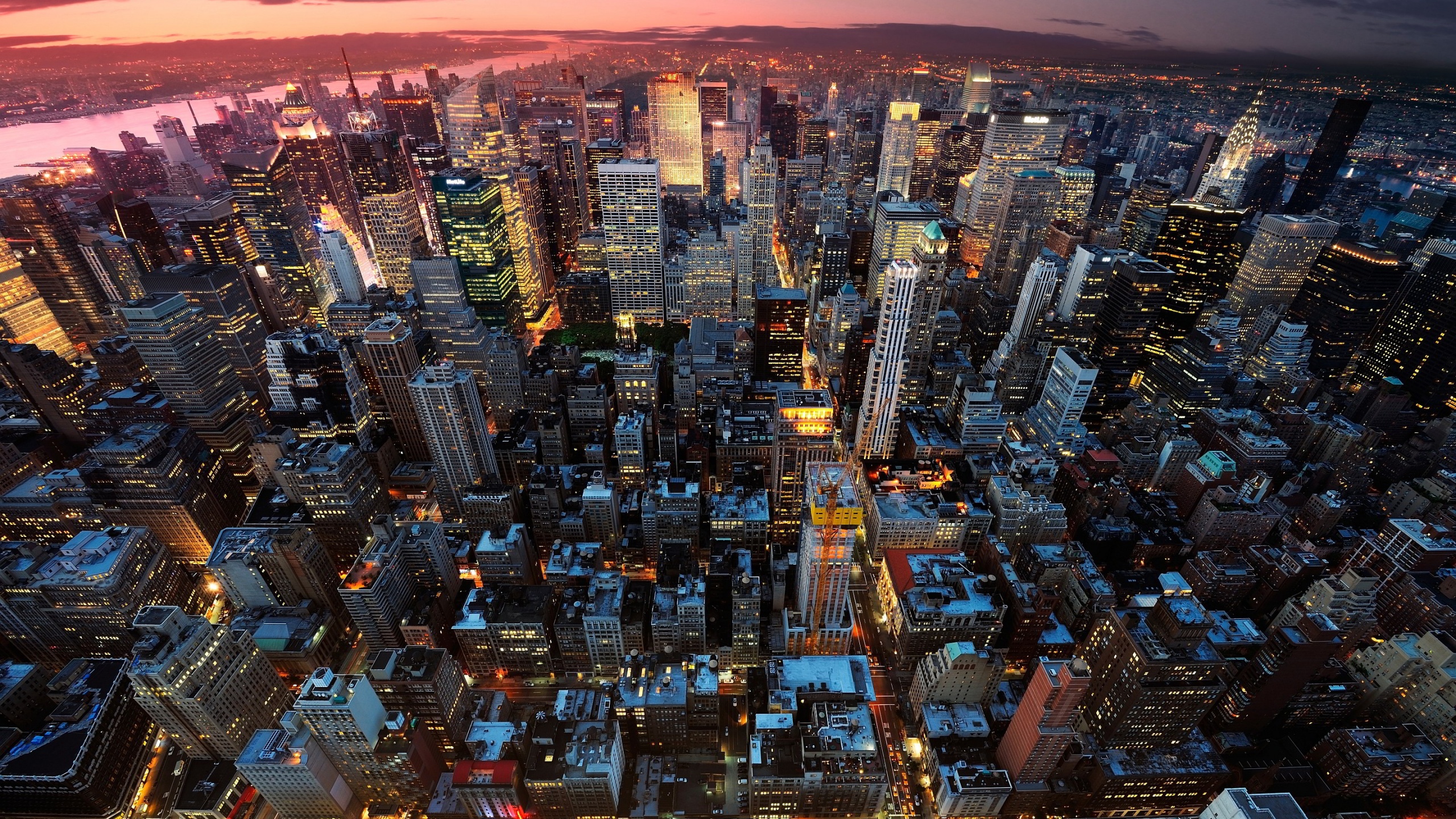 Description: A city at night with a lot of tall buildings and lights on it's sides and a body of water in the distance.