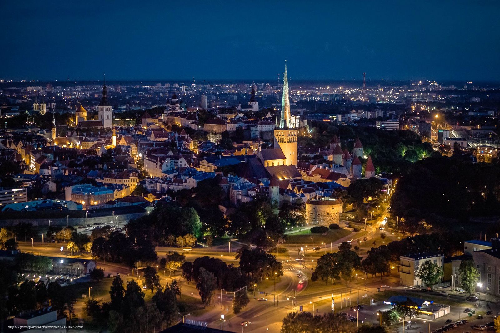 Description: A city at night with a very tall tower in the middle of it's city center and a street light.