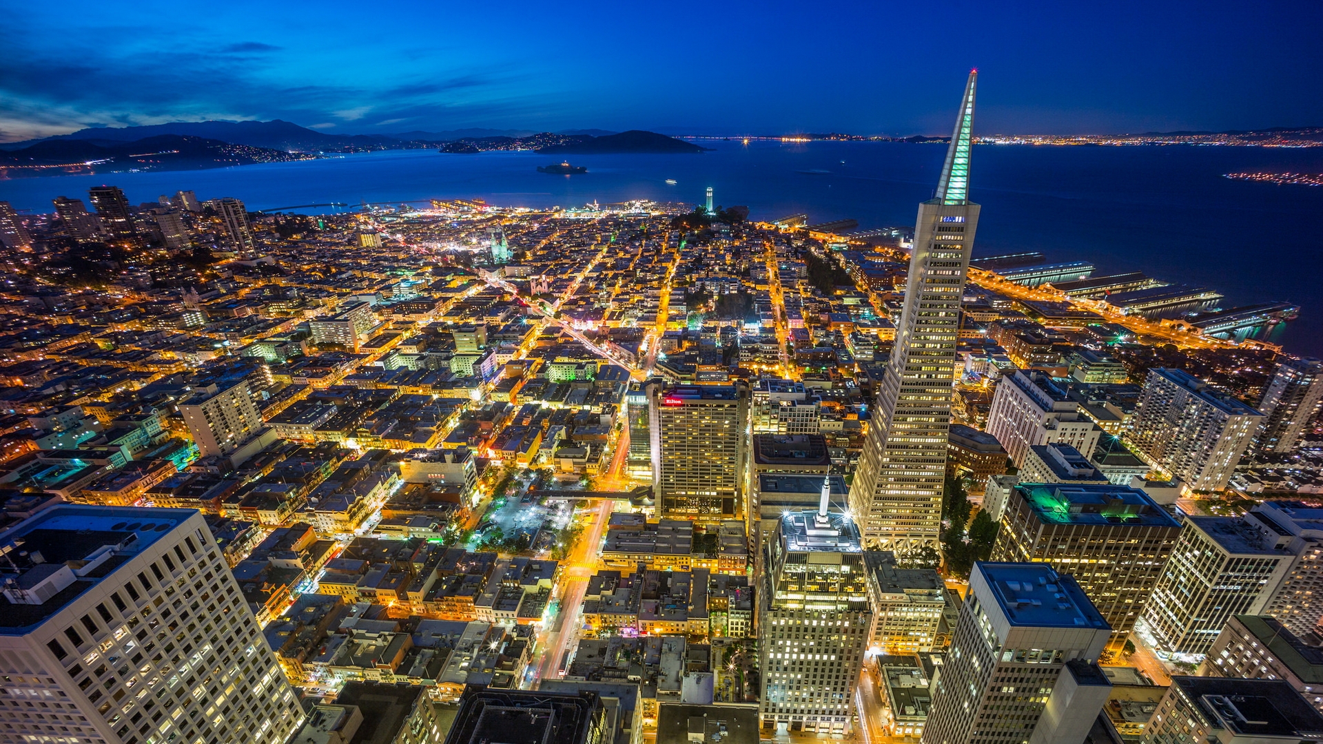 Description: A city at night with a very tall building in the middle of the city and a very large body of water.