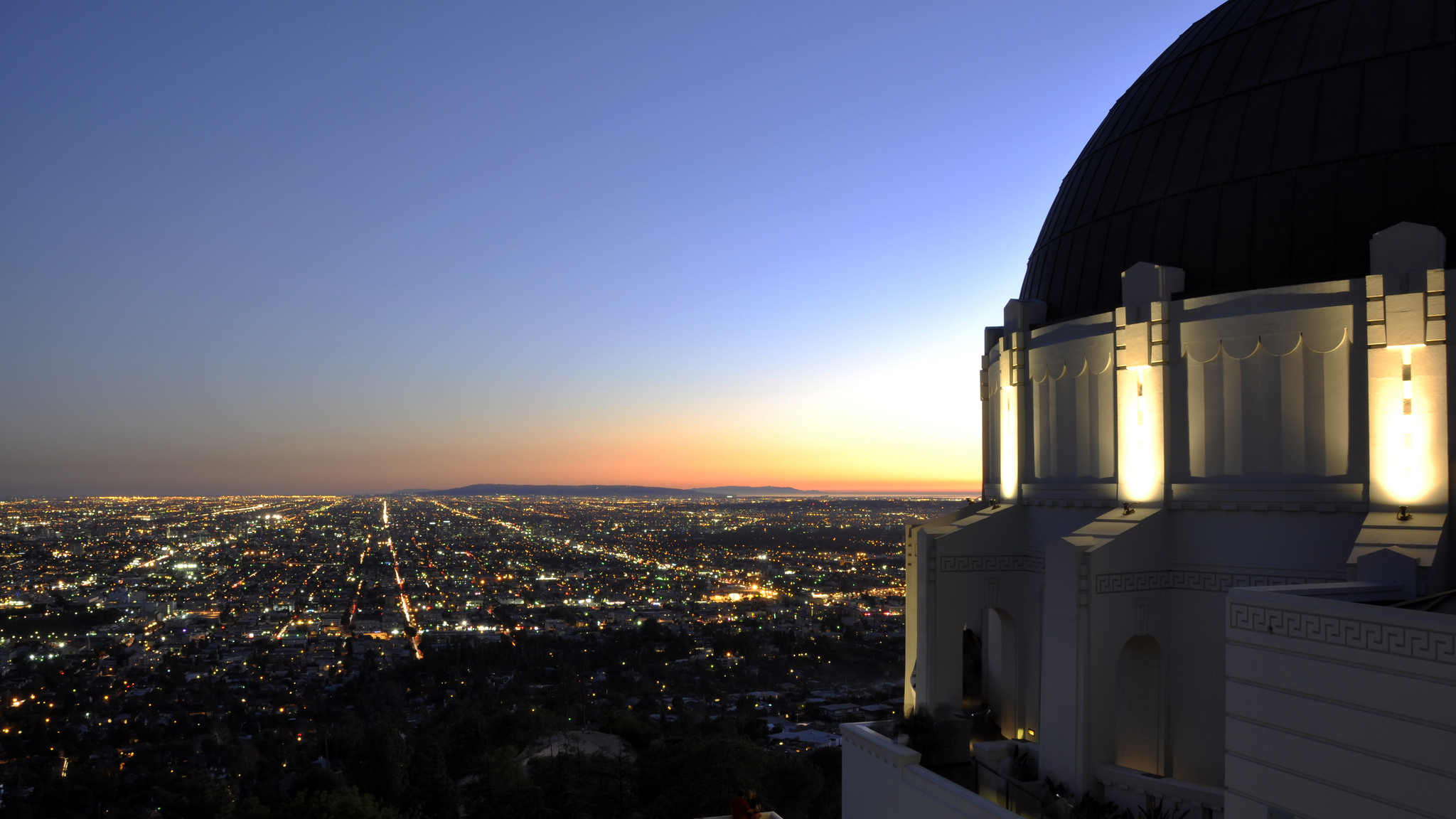 Description: A view of a city at night from a high point of view of a building with a dome on top.