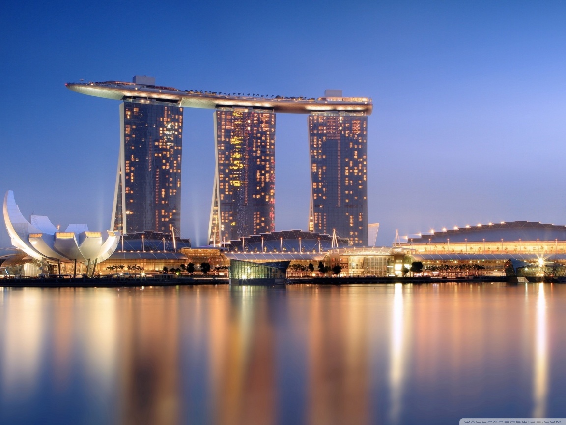 Description: A large body of water with a city in the background at night time with lights on the buildings and the water reflecting off the water.