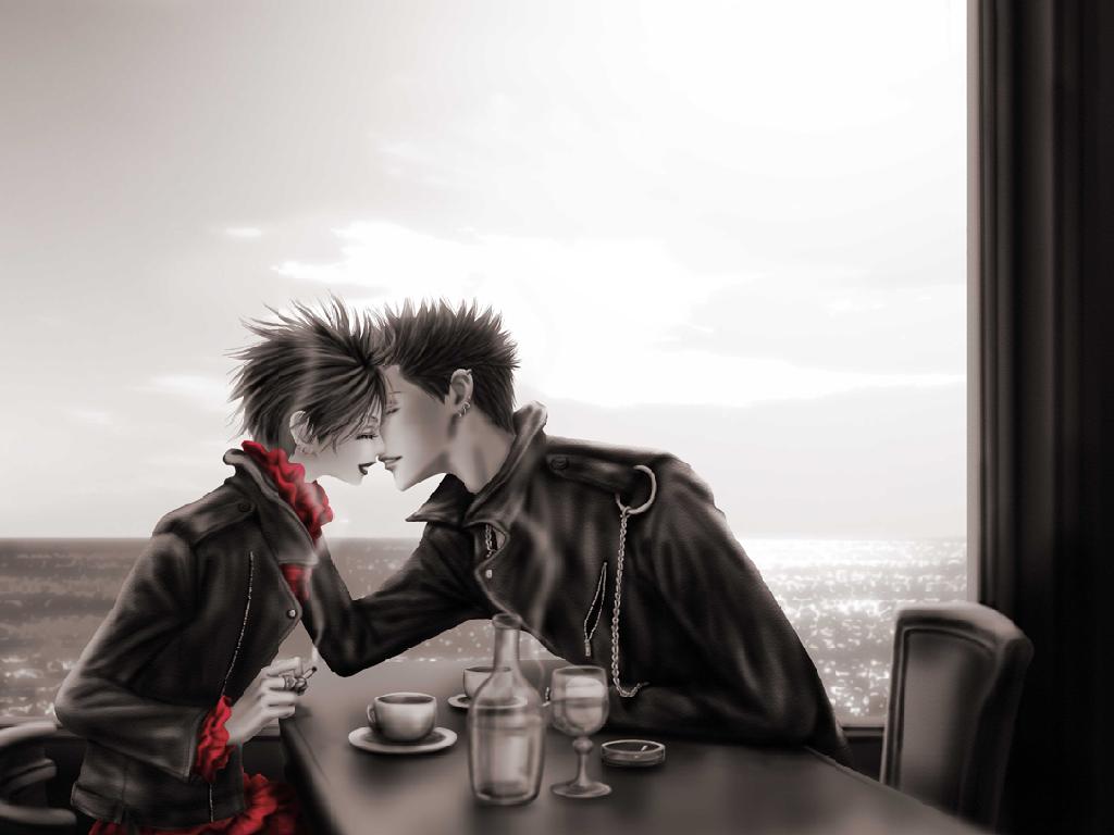 Description: A couple sitting at a table with a view of the city and ocean in the background.